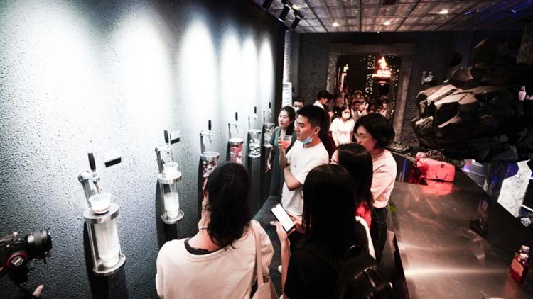 不经意间总有种在宇宙空间站行走的错觉,墙壁里装满兰蔻、SK-II、纪梵希等护肤品小样,正是话梅的品牌理念与整个空间的结合,满满的时尚感与空间感。最吸睛的还是角落里的老式电视机,闪烁的雪花屏配合变幻的灯光,电视负责赛博,酒吧负责朋克,赛博朋克的感觉立马就出来了。