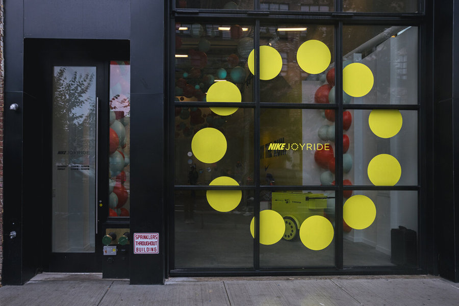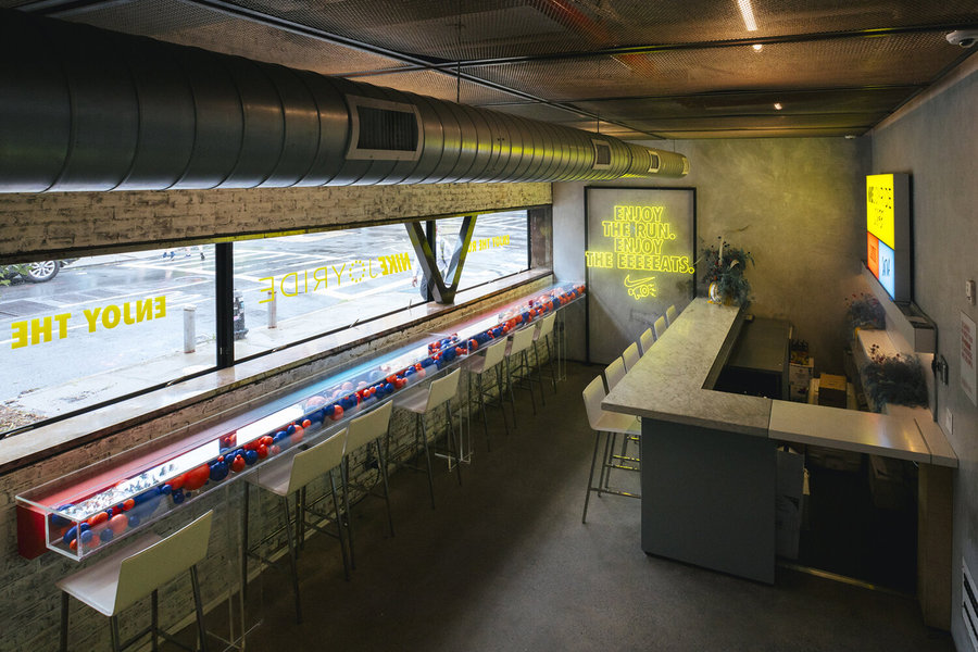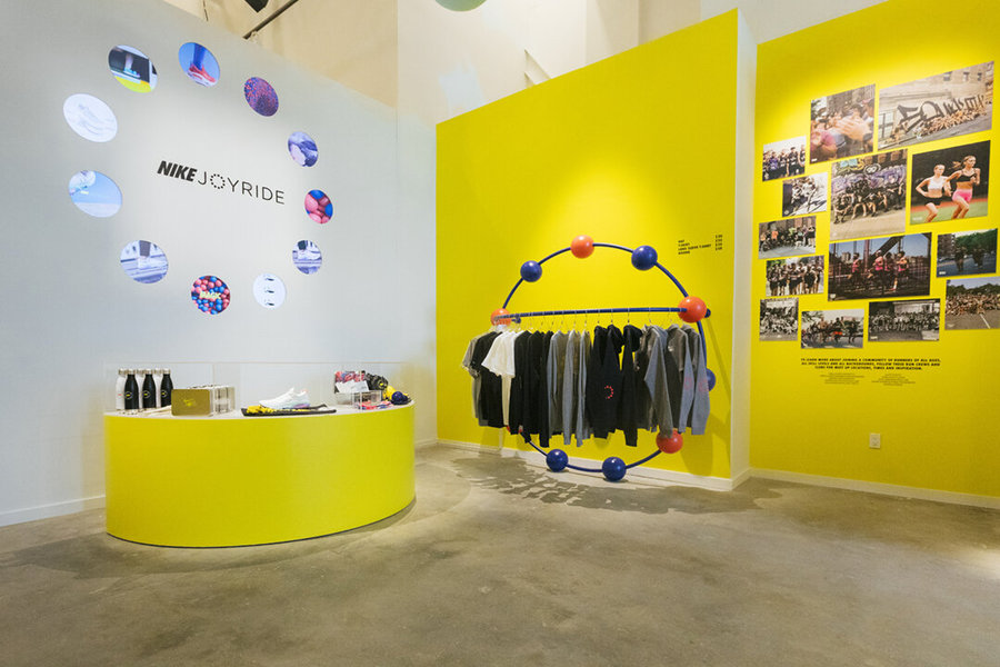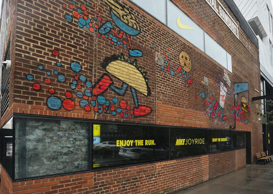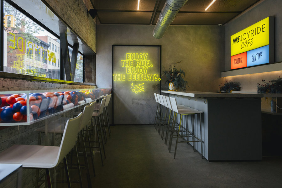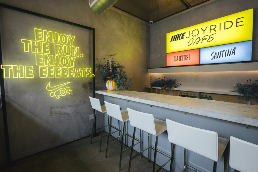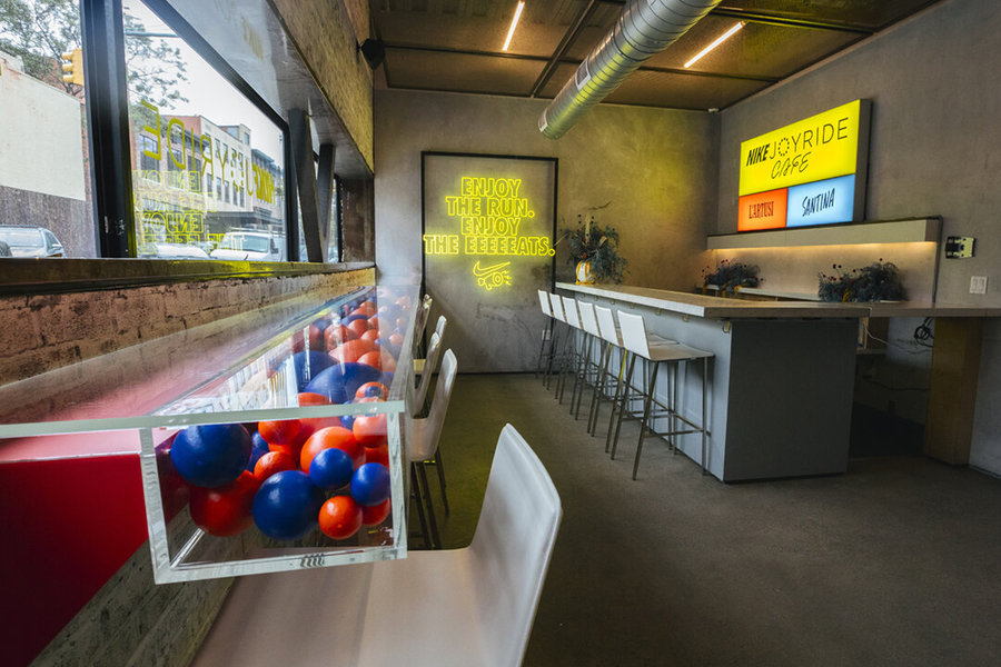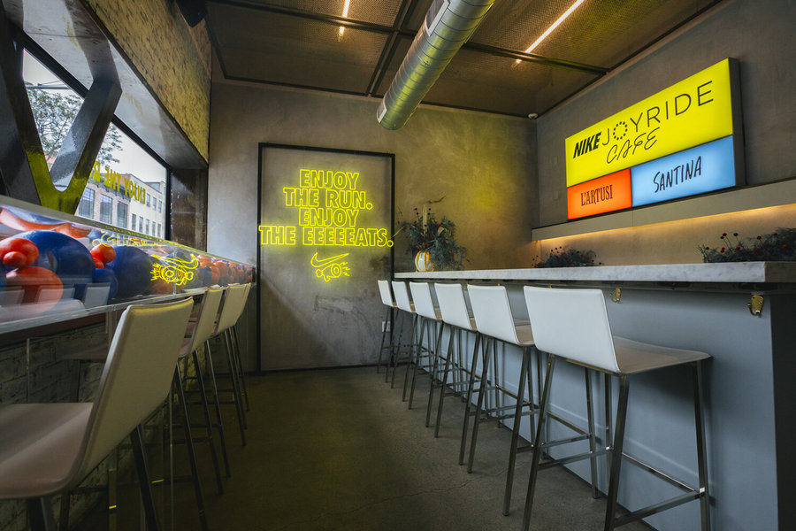 活动执行了一个为期三周的零售和餐饮活动,灵感来自耐克的最新创新:Joyride的珠状鞋底。在耐克的“跑步俱乐部”(Run Club)应用上跑了一英里后,客人就可以进入Joyride的咖啡馆,咖啡馆里有可供选择的旋转主题盘子,并在透明的台面坐下,台面下是丙烯酸树脂的泡沫球,暗示着新鞋底的创意设计。