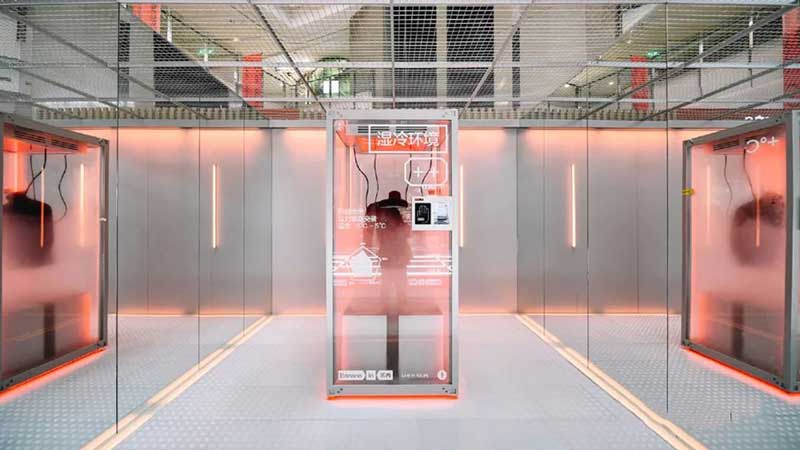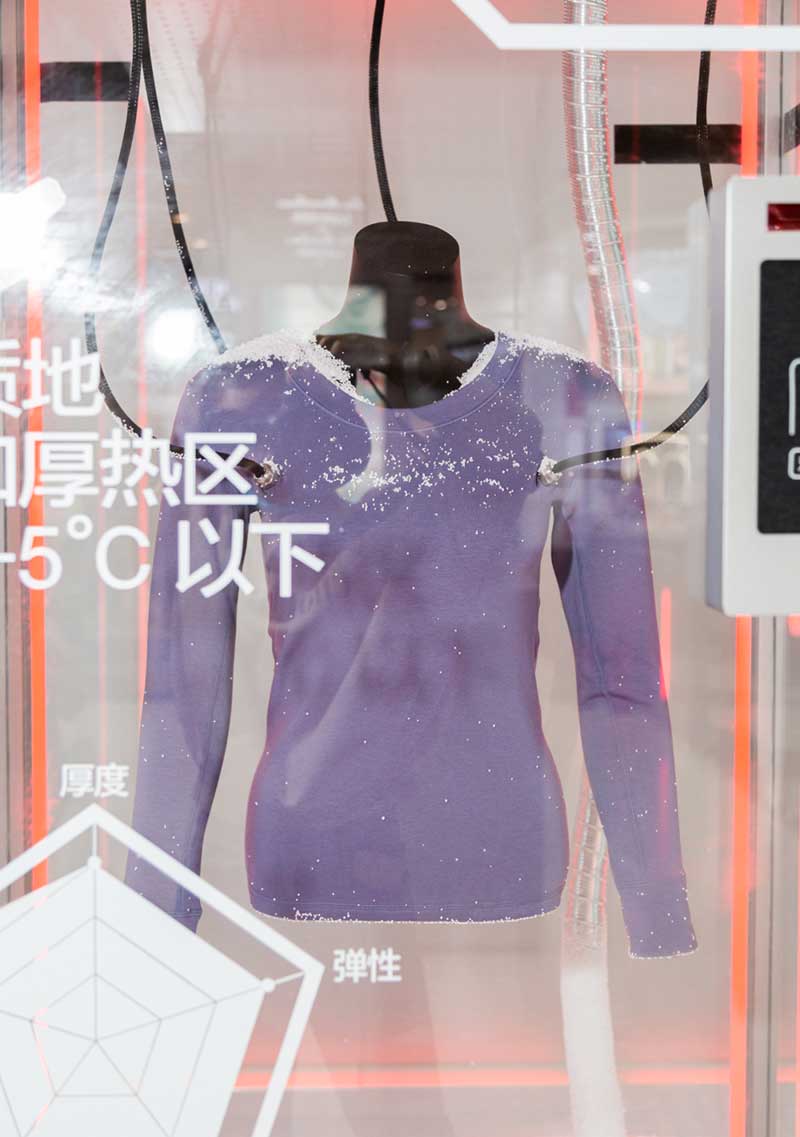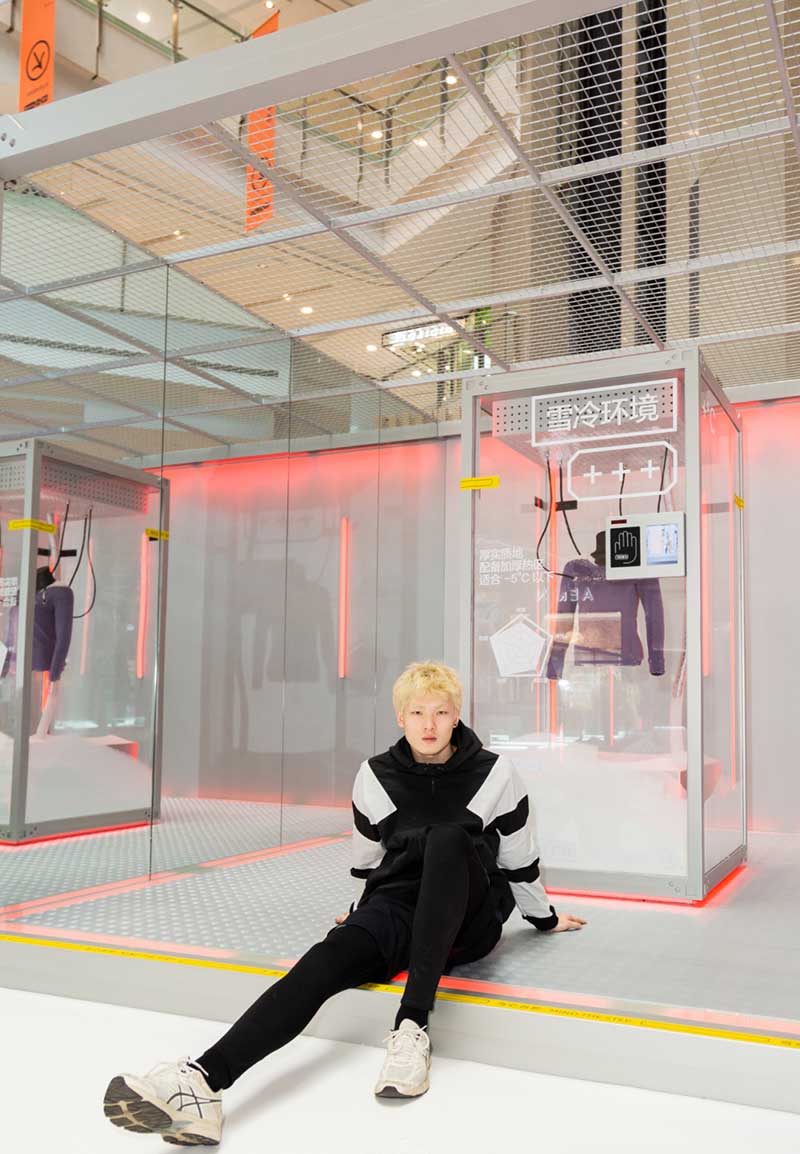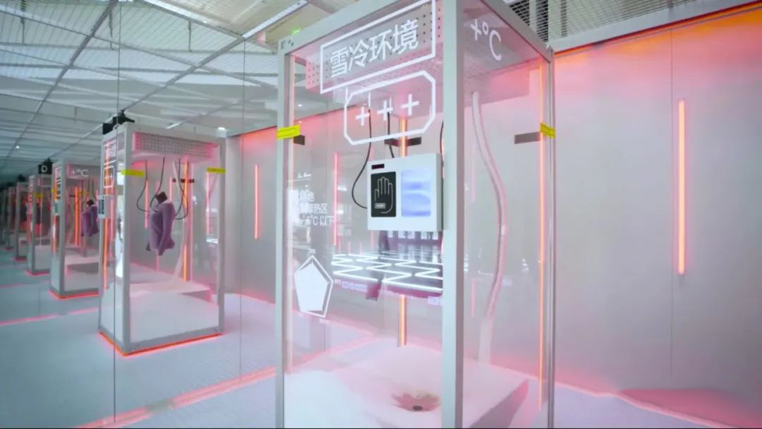 整个快闪里特别吸引的就是三个热皮实验室了,西部世界的既视感。三个实验室模拟了不同的自然环境,分别代表风冷、湿冷和雪冷,也充分的表达了不同地区即使相同温度,体感却是不同的。每个上面都有互动触摸屏,长按能出现不同气候的变化。三个舱根据气候变化,灯光会展现为橙-红-深红渐变色;两侧的镜子无限延伸感非常适合拍大片。