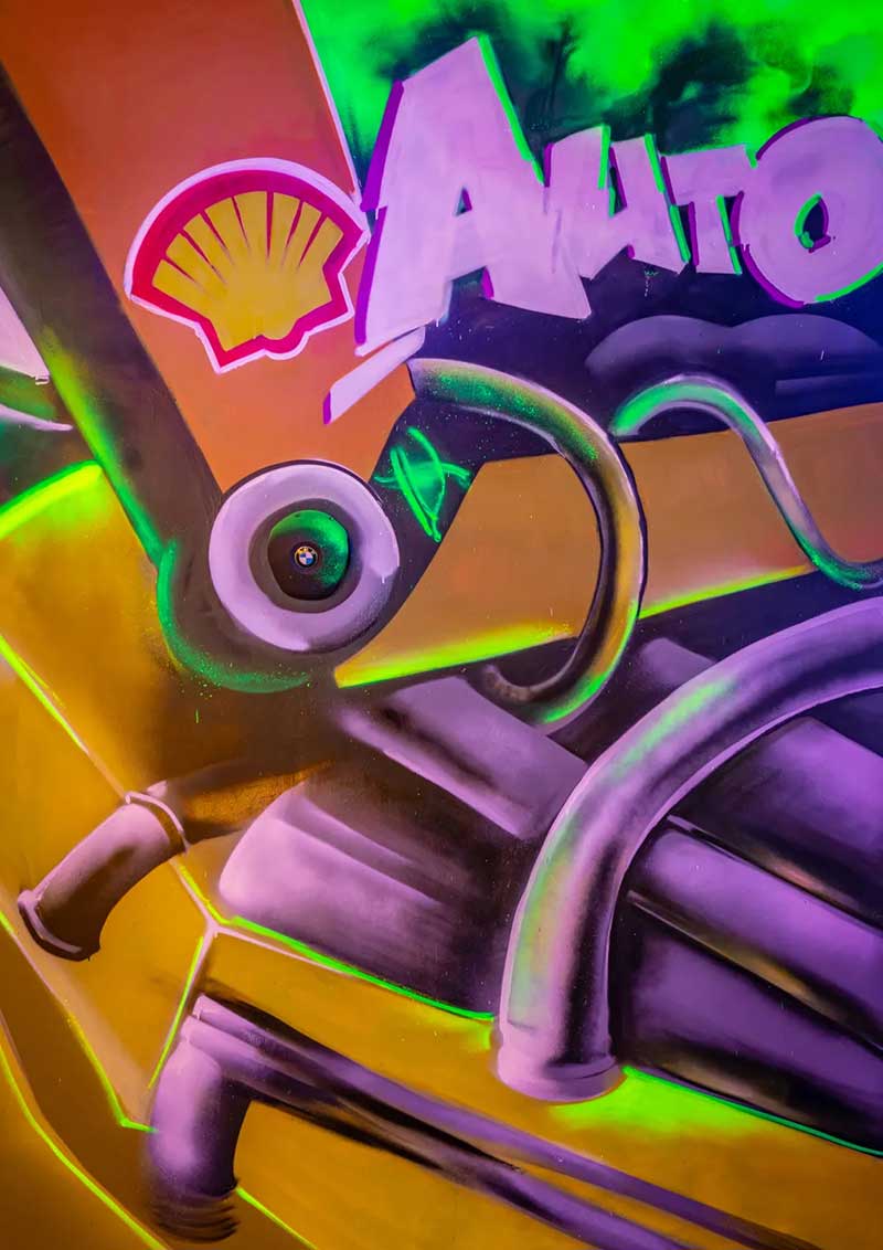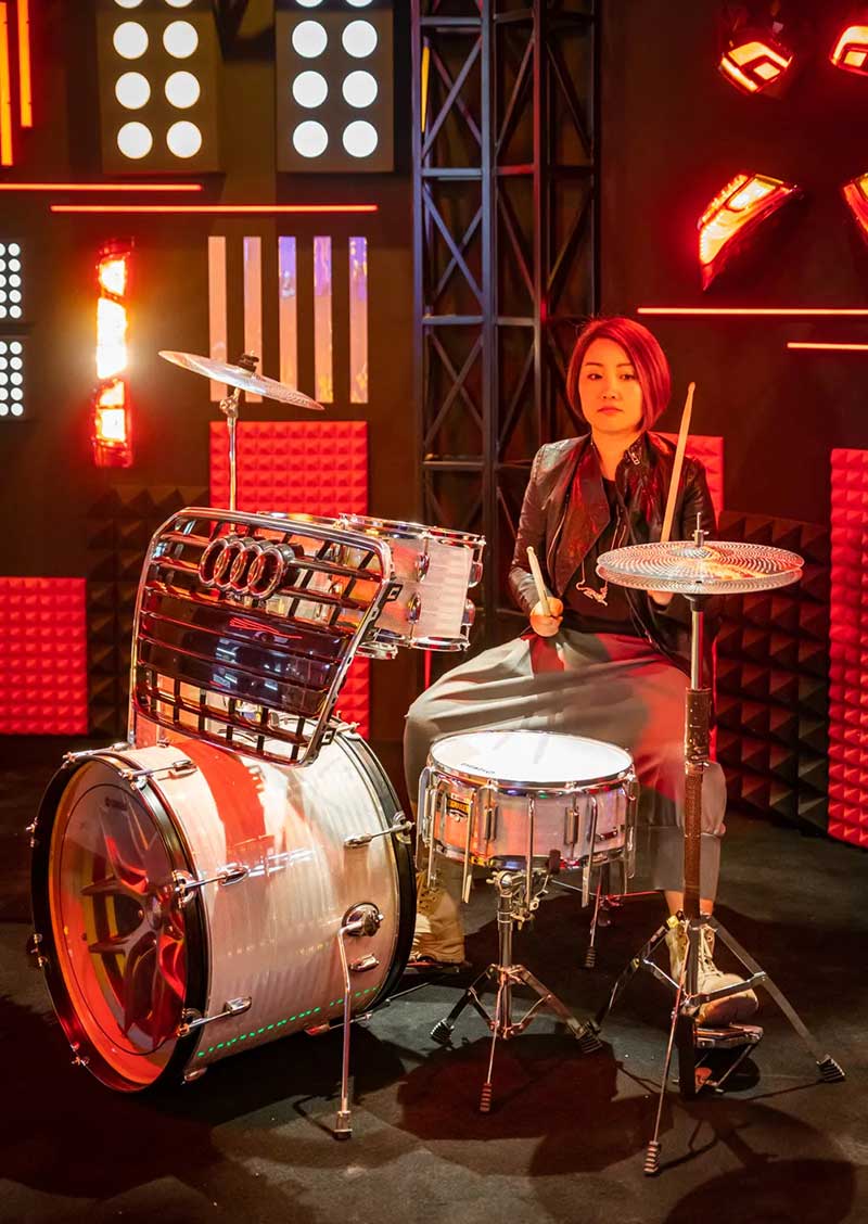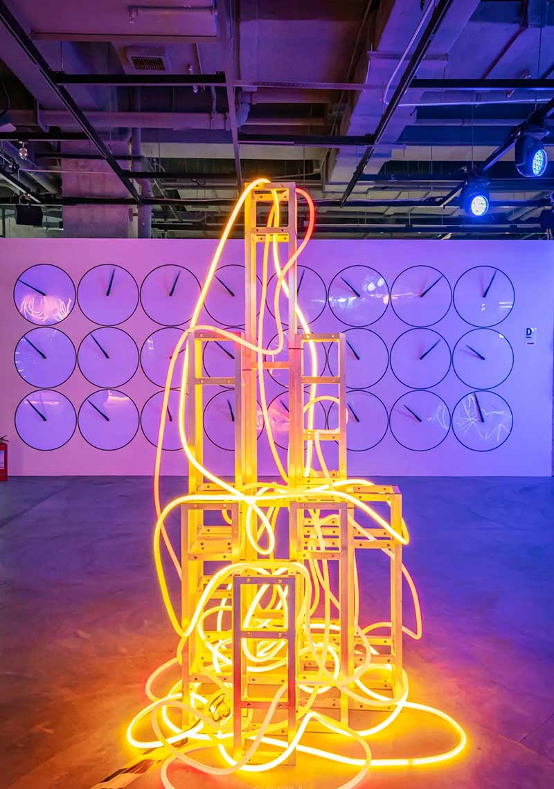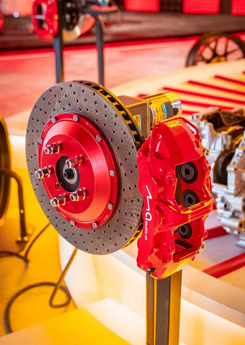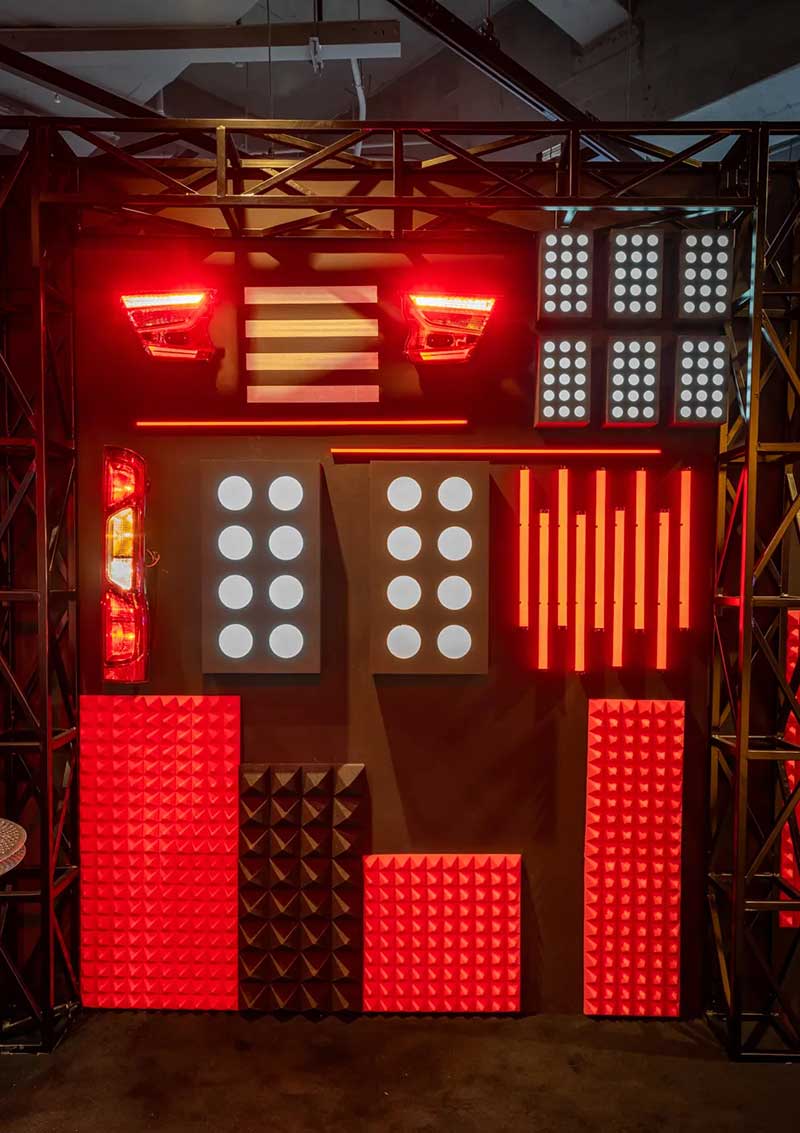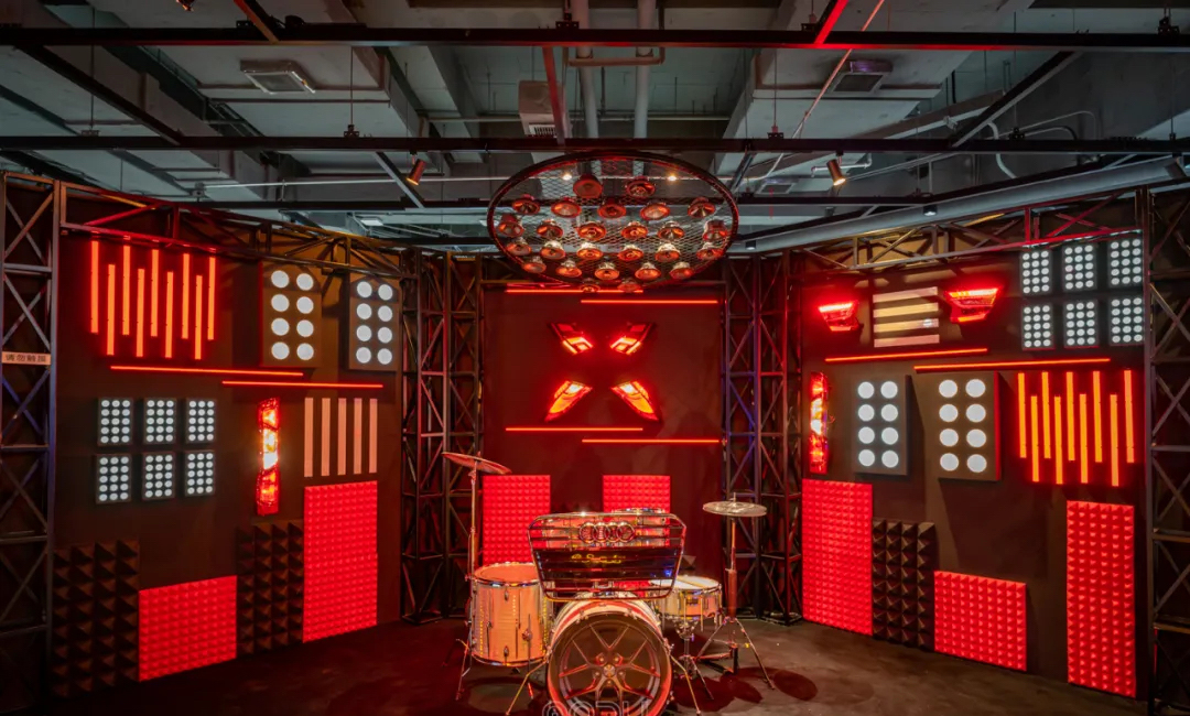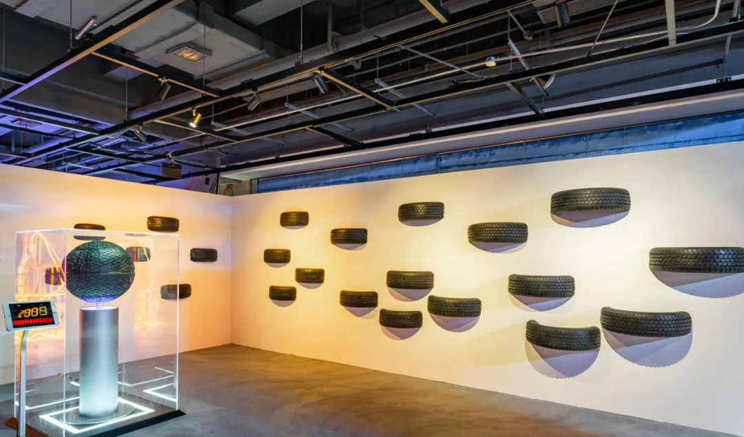 刚走进展区就看到入口处,墙面上有一辆醒目的红色喷漆车架,四周围绕着霓虹灯,你很难不会为了它停下来静静欣赏。黄色的车轮毂及盖板,为展区增添了酷炫夺目的魅力,线条清晰利索的车悬架,让你时刻感受到它的速度与激情。底盘虽然没有很强烈的冲击感,却是必不可少的部件,低调沉默的向同一个目标奋进,像极了那些因梦想诞生于低处时,发着光的梦想家。