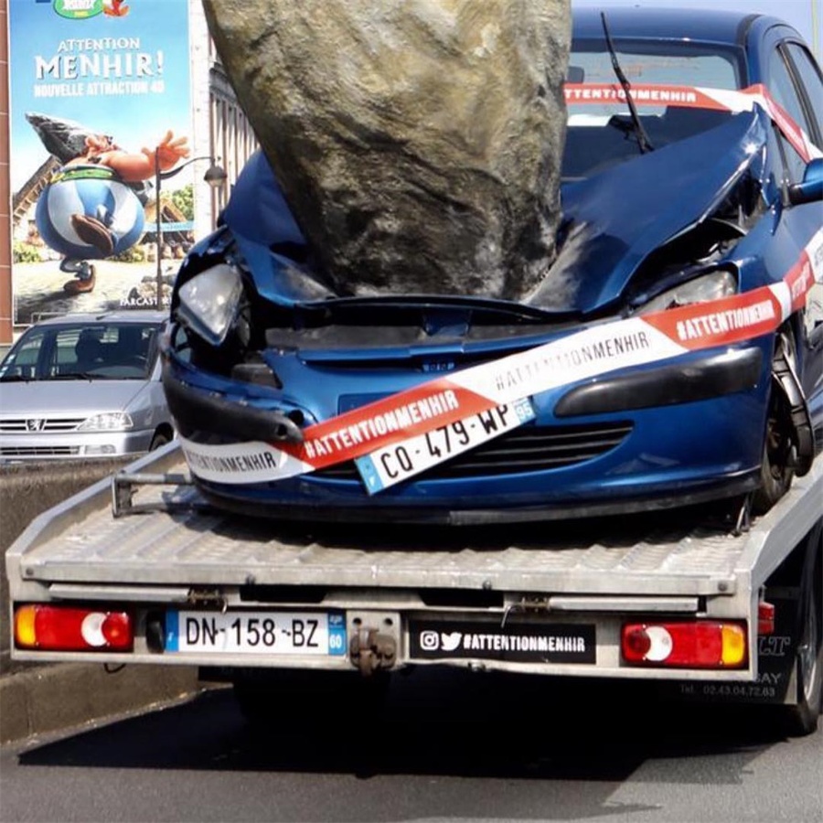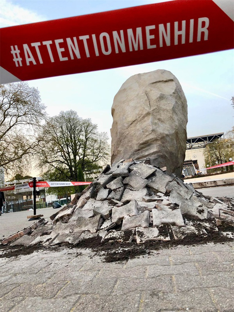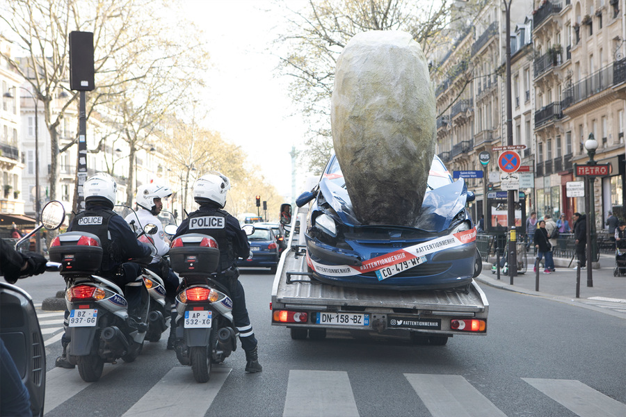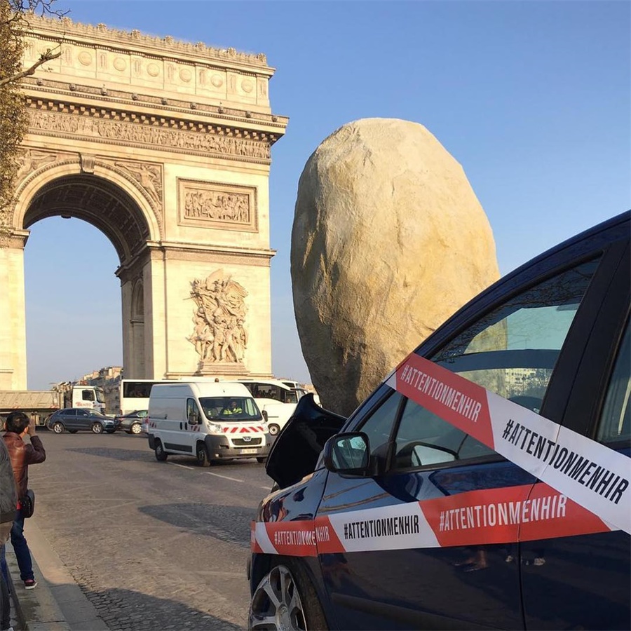 在该景点开放的前几天,里昂、南特和里尔的行人醒来时看到了一个奇怪的景象:人行道上出现了一块巨大的石头,周围是碎石,好像是从天上掉下来的。在巴黎,一辆汽车的引擎盖被巨石砸穿,看起来这辆车在错误的时间出现在了错误的地点,这辆车被装在一辆卡车上,穿梭在城市里,最大限度地暴露在大众面前,和其他巨石装置一样,它也被警示带缠绕着,上写着“注意!巨石”。