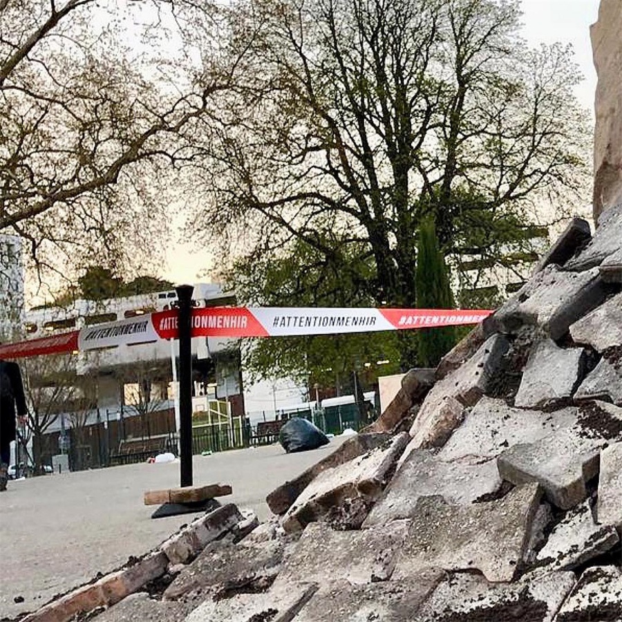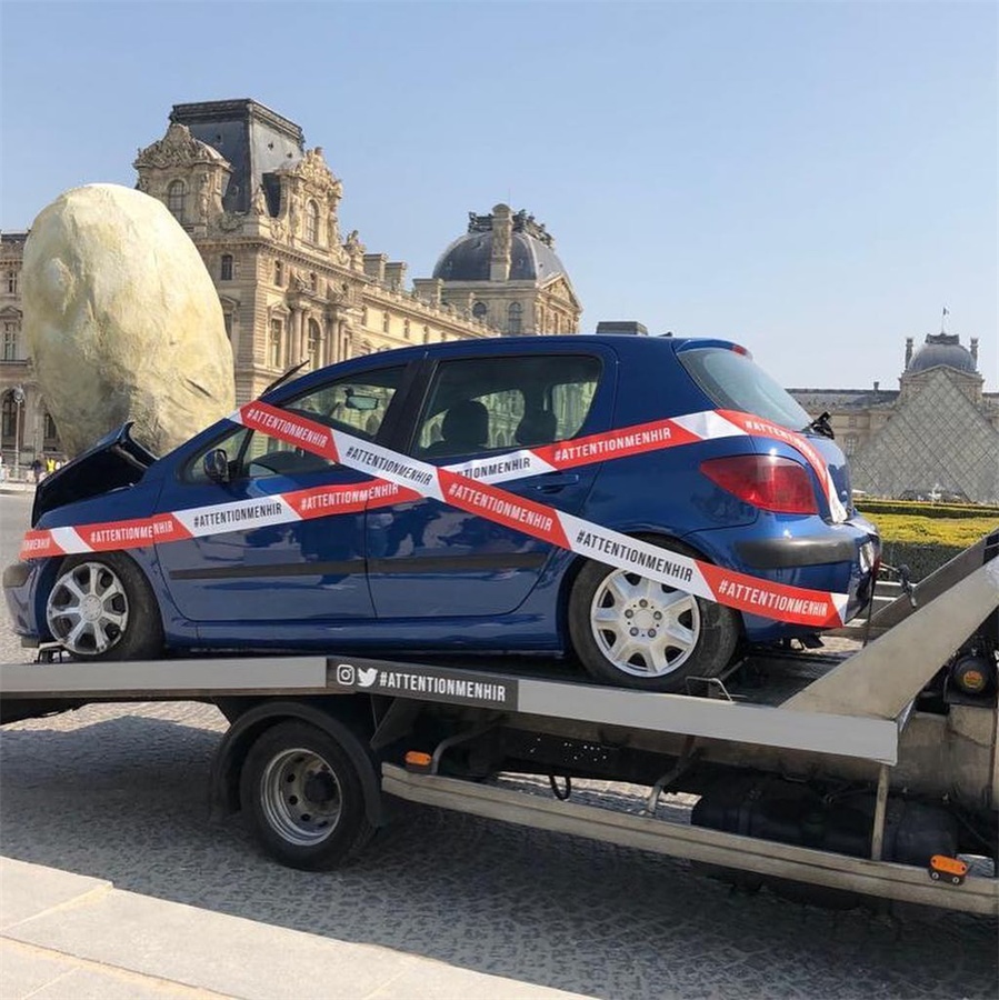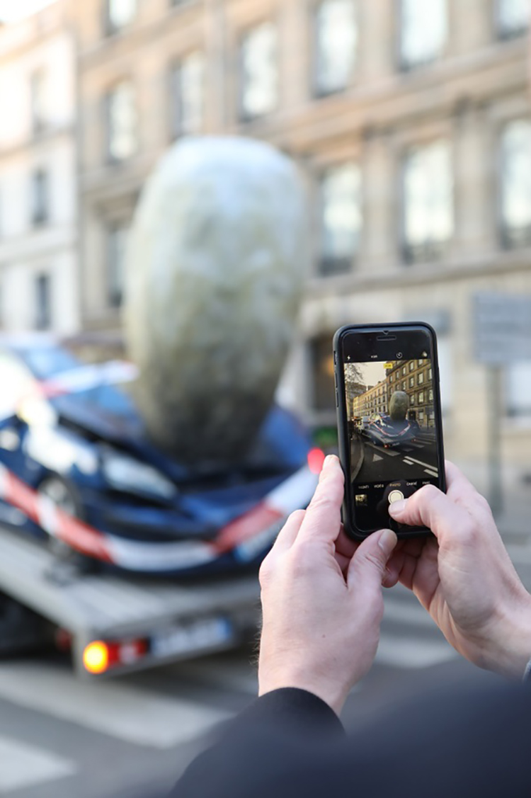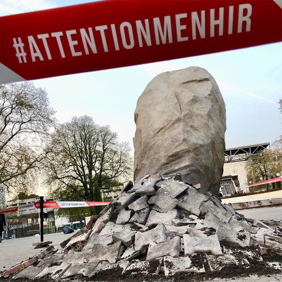 在该景点开放的前几天,里昂、南特和里尔的行人醒来时看到了一个奇怪的景象:人行道上出现了一块巨大的石头,周围是碎石,好像是从天上掉下来的。在巴黎,一辆汽车的引擎盖被巨石砸穿,看起来这辆车在错误的时间出现在了错误的地点,这辆车被装在一辆卡车上,穿梭在城市里,最大限度地暴露在大众面前,和其他巨石装置一样,它也被警示带缠绕着,上写着“注意!巨石”。