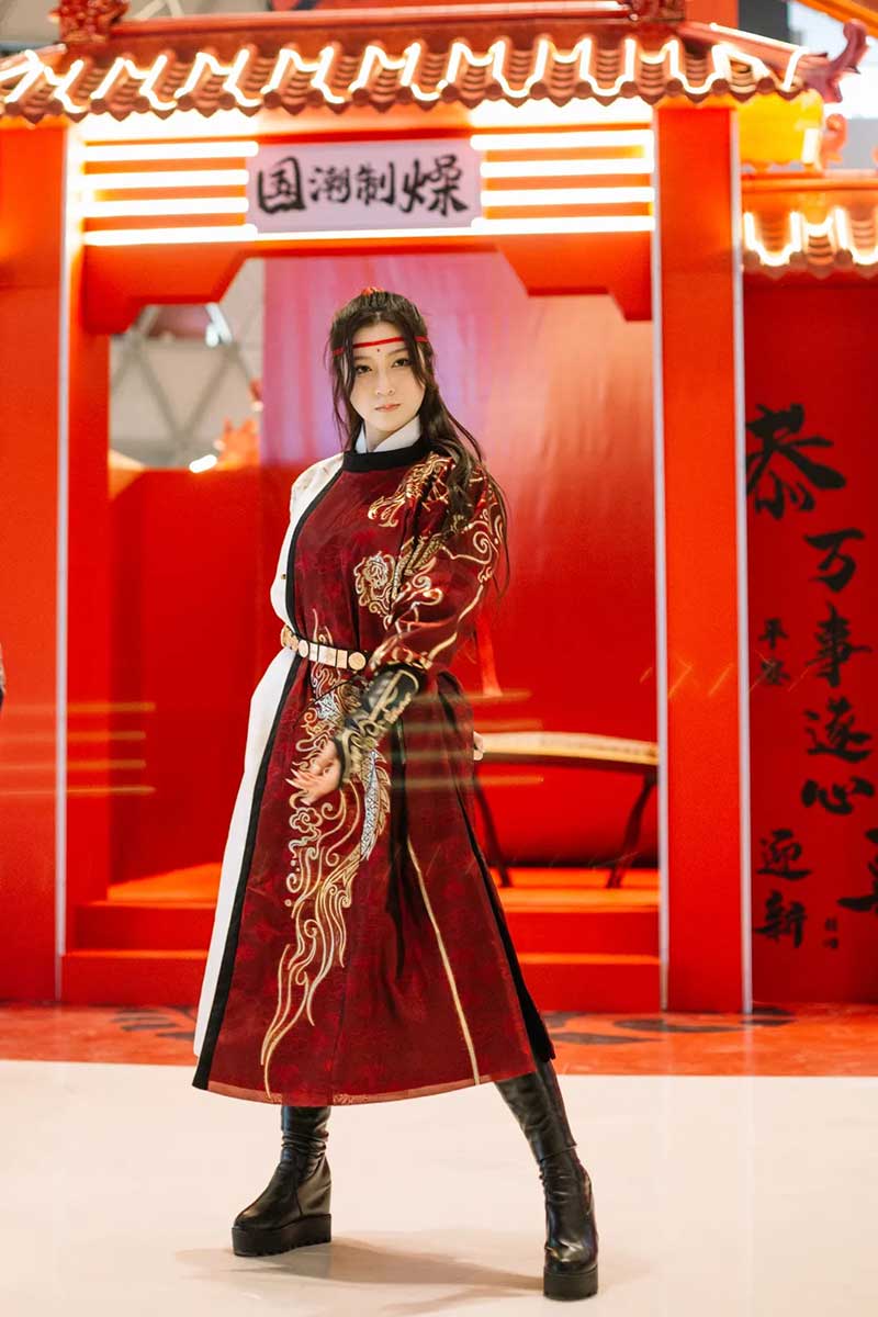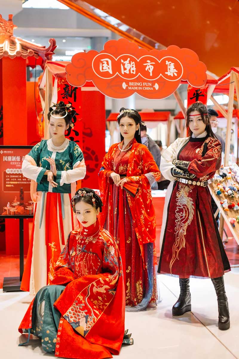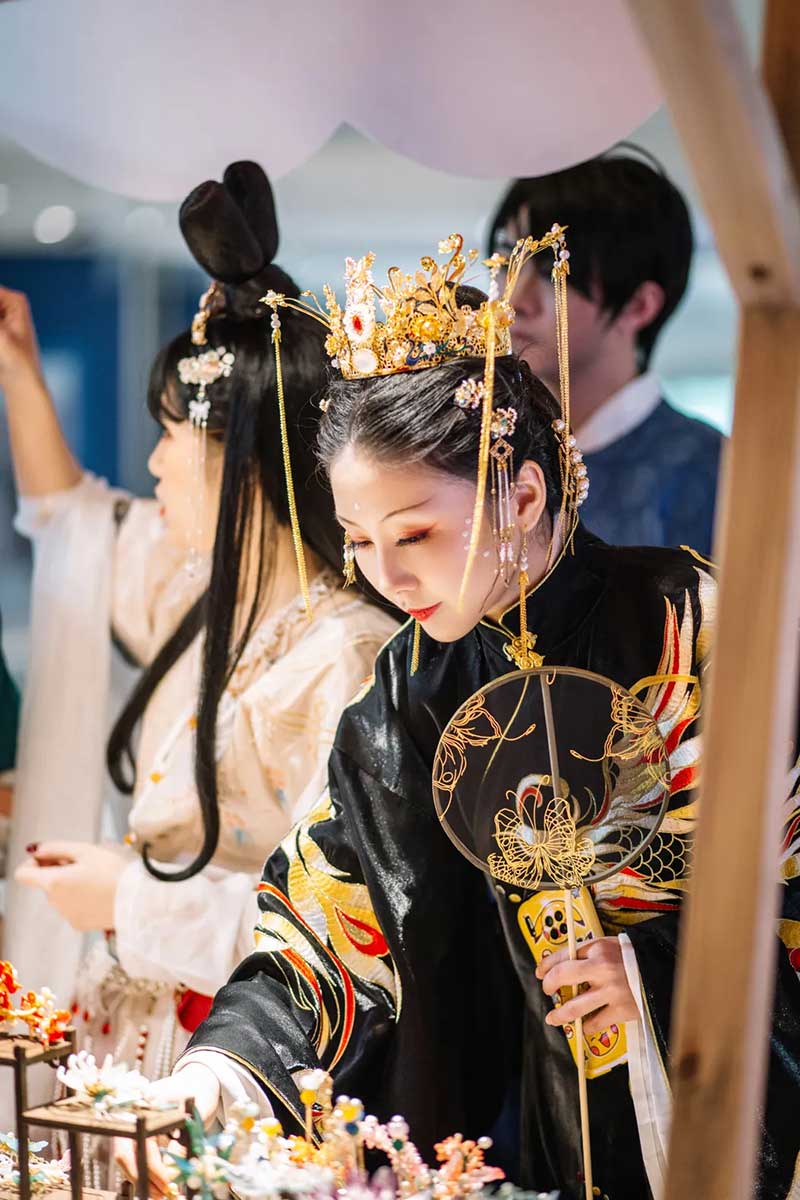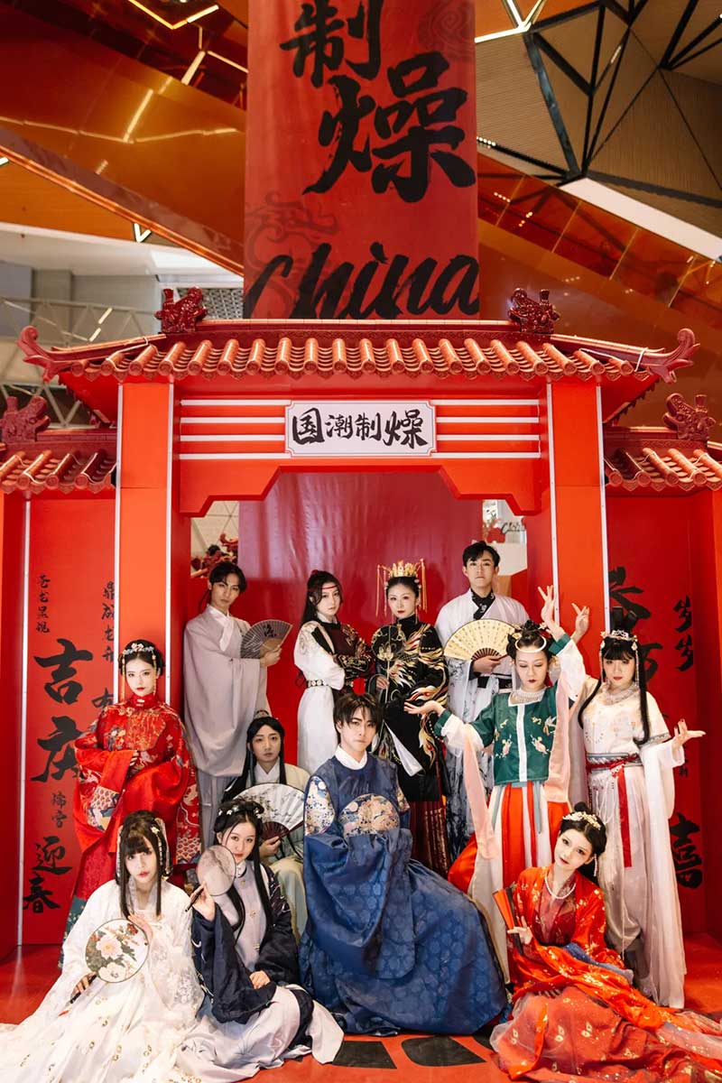 除了汉服,东苍龙还有国风舞蹈快闪、鼓乐演奏等表演。灯光亮,鼓声起,异彩纷呈的节目给你一个突破传统却又年味十足的国潮盛宴。这厢国粹传承,另一边的国潮市集里,民俗的、新奇的好物齐聚,热闹非凡,看尽十里繁华。手工文创蕴藏传统文化,手作的胸针、发钗精细小巧,金丝缠绕,万般柔情涌上心头。沉迷于汉服魅力和国风表演中,别忘了来打卡当红国潮制燥展。