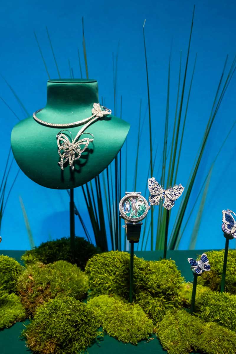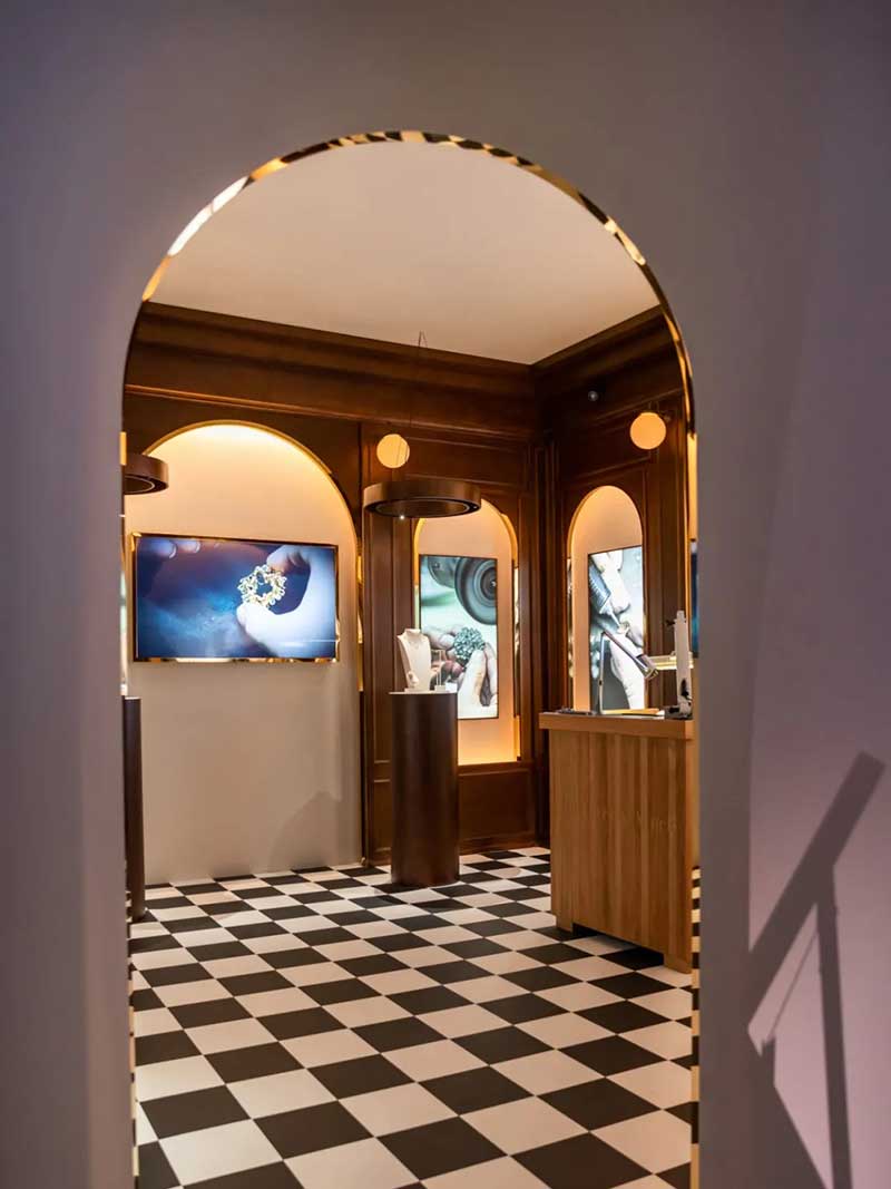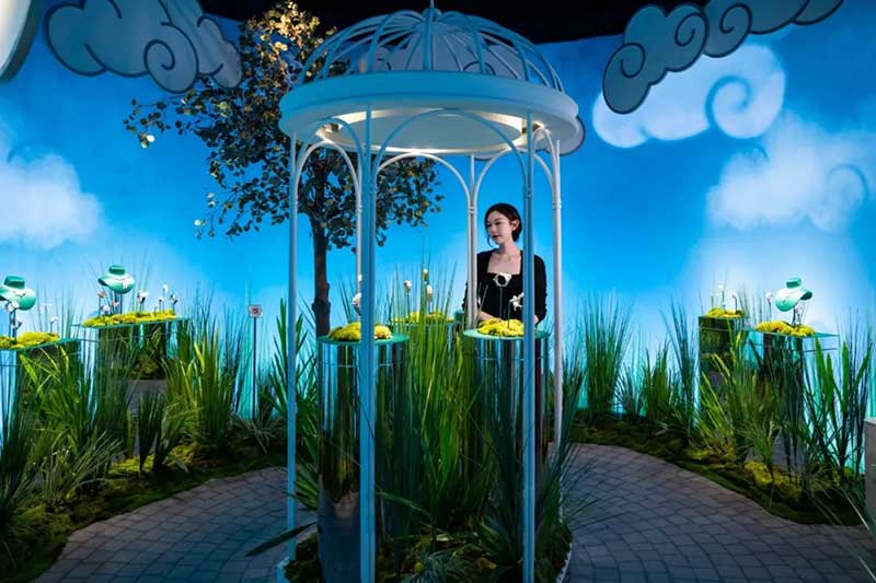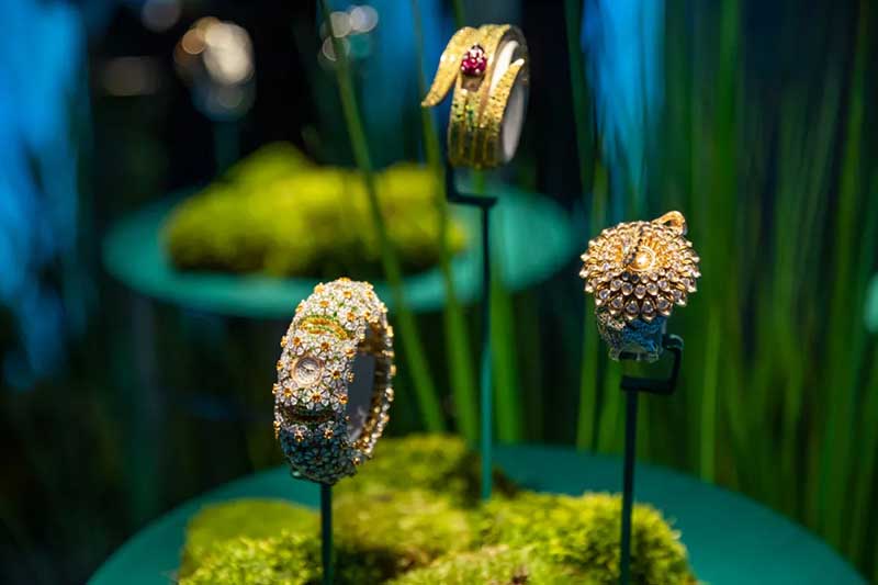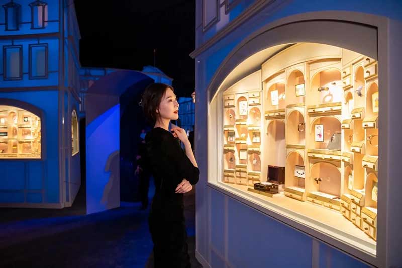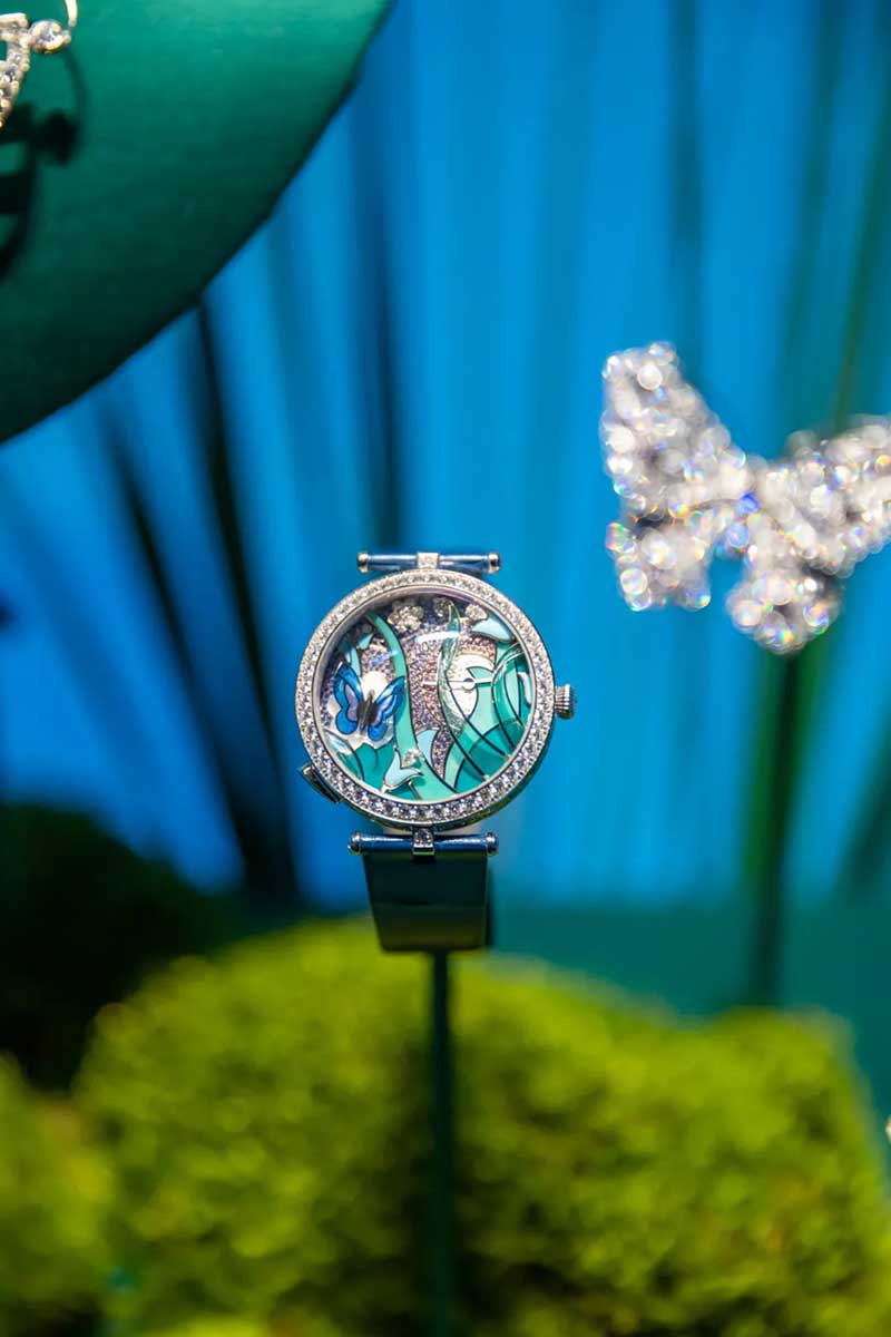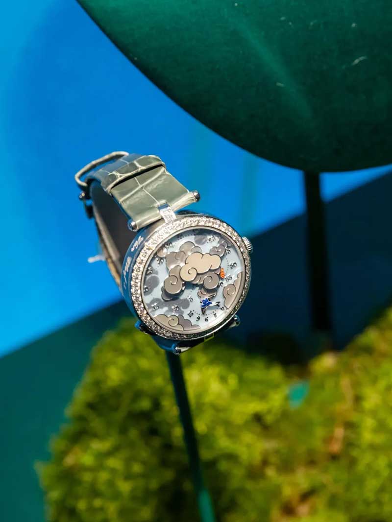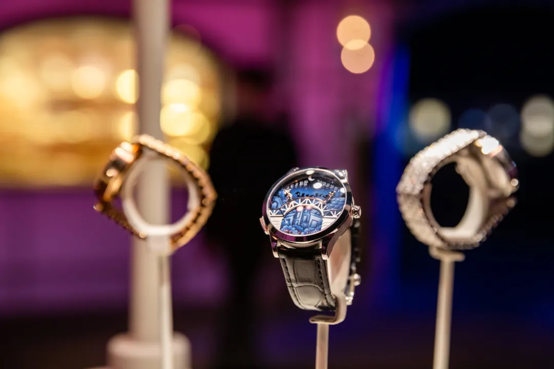 从还原“情人桥”腕表表盘的圆形拱门进入,便来到了打造成芳登广场的梦幻空间。四周建筑上的投影和灯光,随日夜时间而变换,如梦中奇境般的氛围,正好与世家一直以来的诗意浪漫相呼应。广场的两侧,各放置两个珍宝柜,陈列着世家各个年代的代表性臻品典藏。其中不乏一些新奇有趣的作品,或是融入了东方元素,或是使用了木质材料,还有各种类型的隐秘式腕表,让你发现原来“打开表盘”可以有这么多好玩的方式。