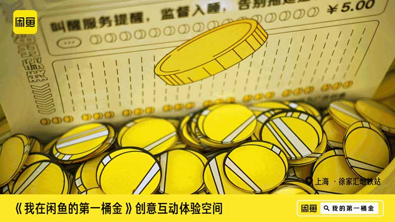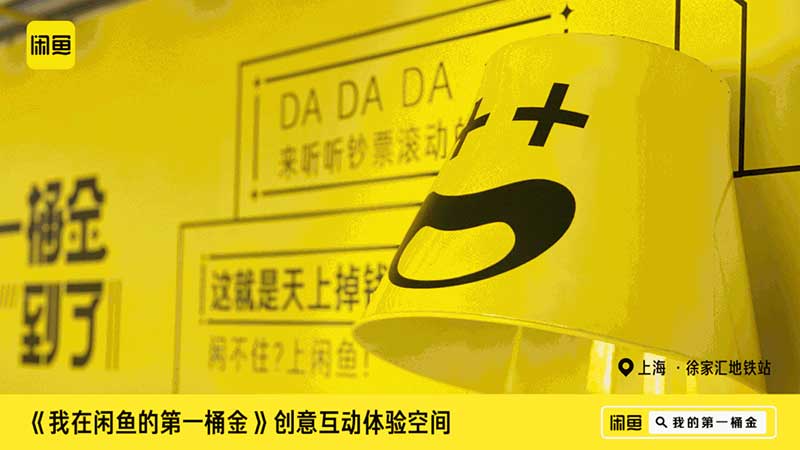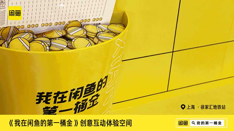 作为上海最主要的CBD核心商圈之一,人流众多的徐家汇地铁站,最近变成了超洋气的互动打卡点,巨大的“第一桶金”账单太吸睛啦。闪耀夺目的金桶倒挂在墙面上,DUANG!第一桶金在头上暴扣,参加互动的路人们可以体验一把被财富包围的快乐!
