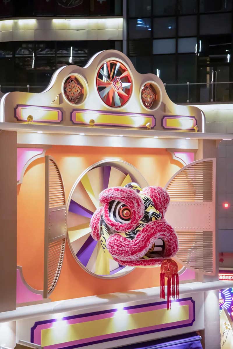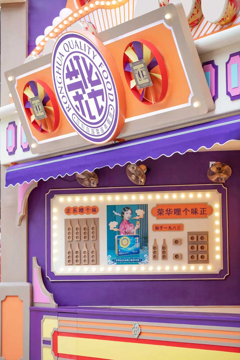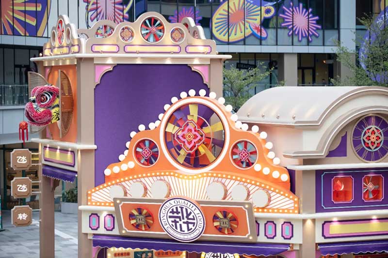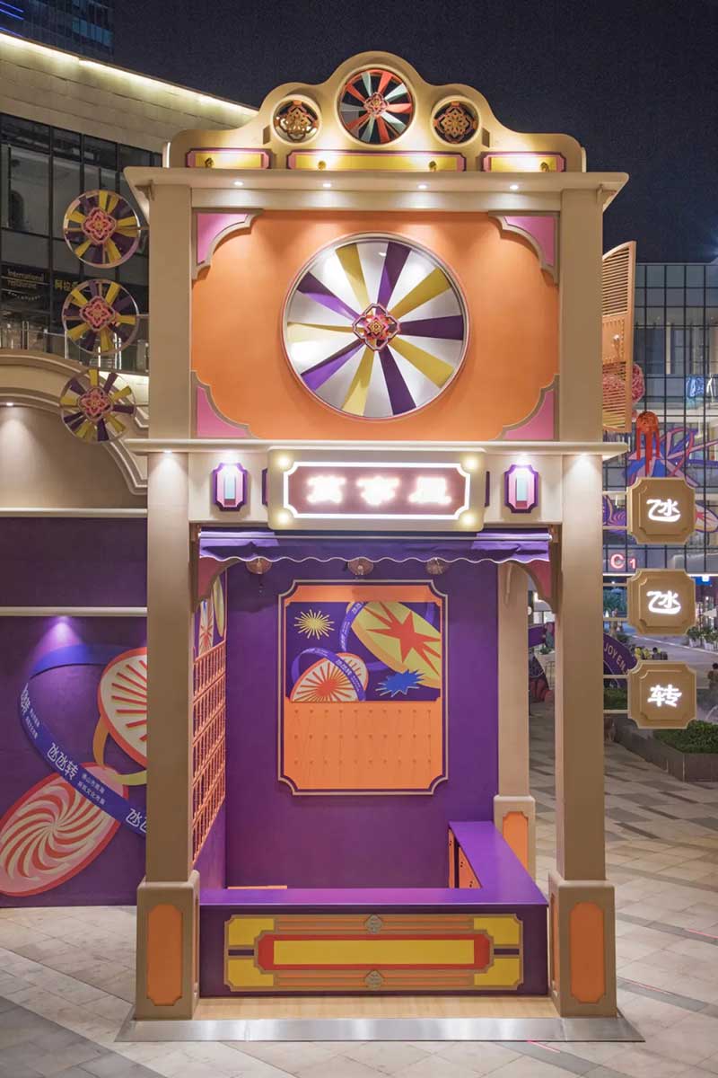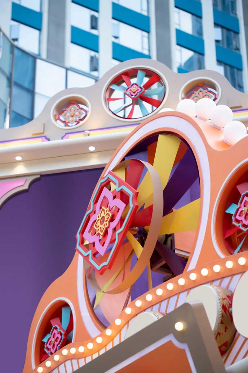除了经典的骑楼、戏院、舞狮、士多店,我们将粤语童谣“氹氹转”与风车元素结合,作为贯穿装置与平面设计的主题元素。高饱和度色彩让人回想起传统士多店门口的玻璃糖罐,罐子里放满五彩缤纷的糖纸。撞色带来既复古又有点酷的感觉,“土潮感”因包容性强而显得更友好,让整体氛围和谐又温馨。