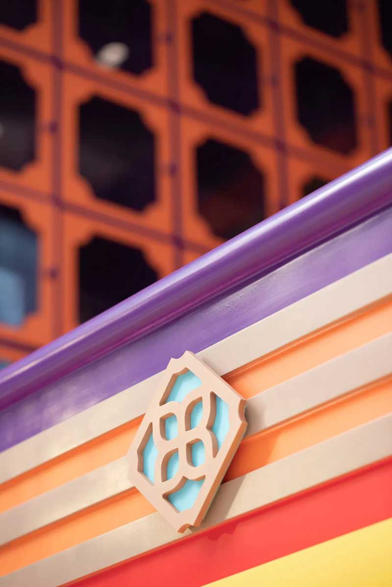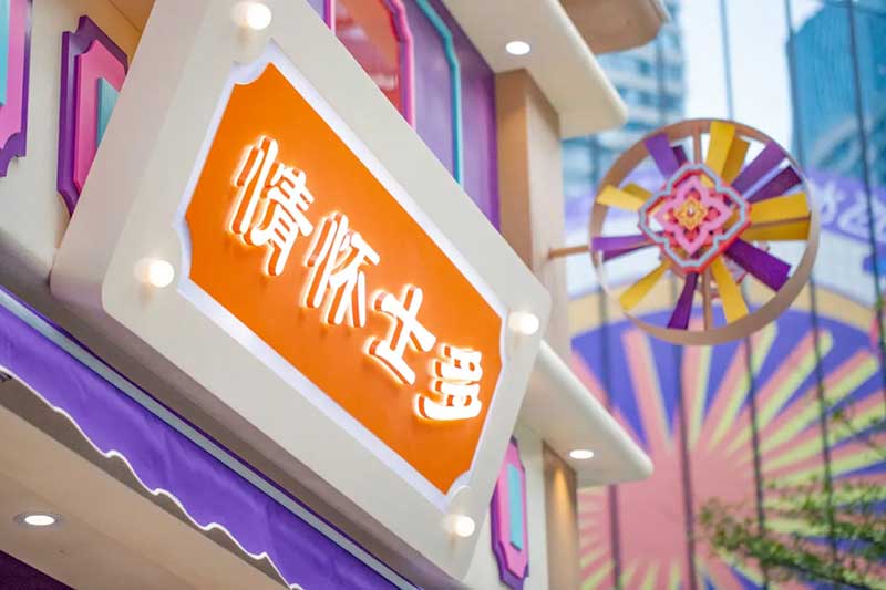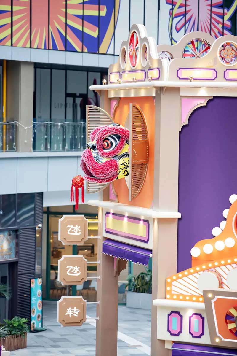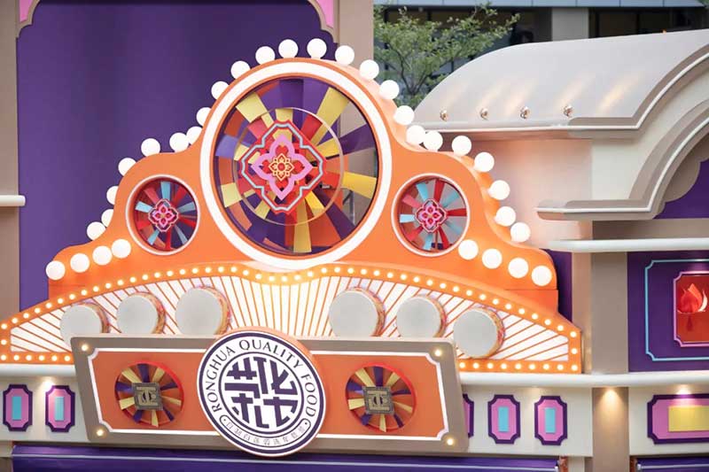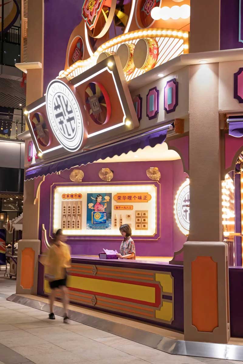 除了经典的骑楼、戏院、舞狮、士多店,我们将粤语童谣“氹氹转”与风车元素结合,作为贯穿装置与平面设计的主题元素。高饱和度色彩让人回想起传统士多店门口的玻璃糖罐,罐子里放满五彩缤纷的糖纸。撞色带来既复古又有点酷的感觉,“土潮感”因包容性强而显得更友好,让整体氛围和谐又温馨。