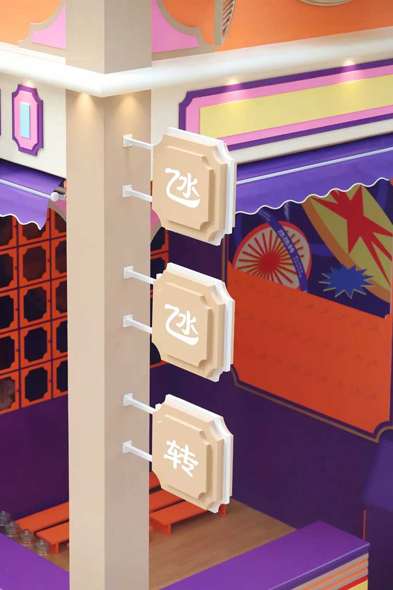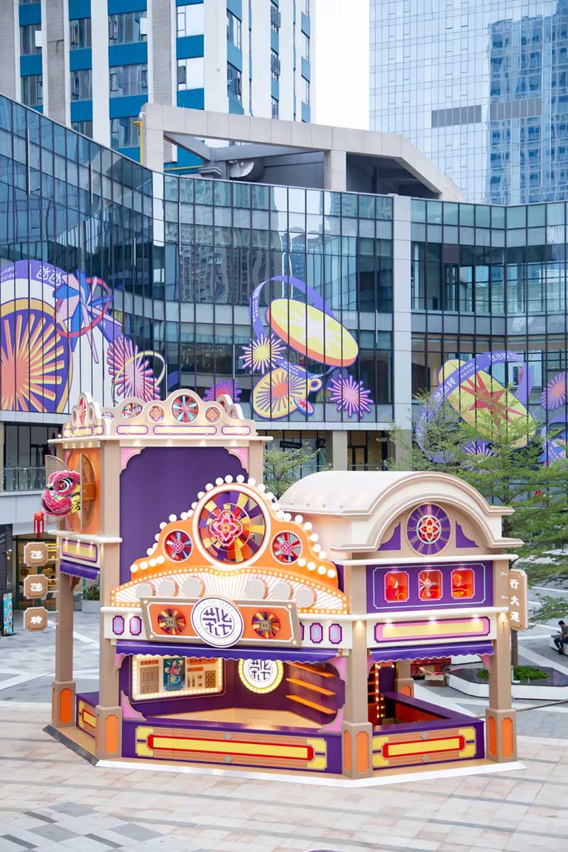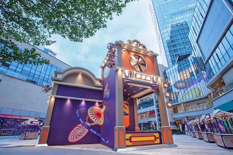 与相对独立的快闪店不同,在商场中庭这个更为开放、立体的空间中,以大型装置打造主体视觉中心,并将主题视觉元素以幕墙窗贴、市集摊位等形式向外辐射,形成全方位的体验场景。