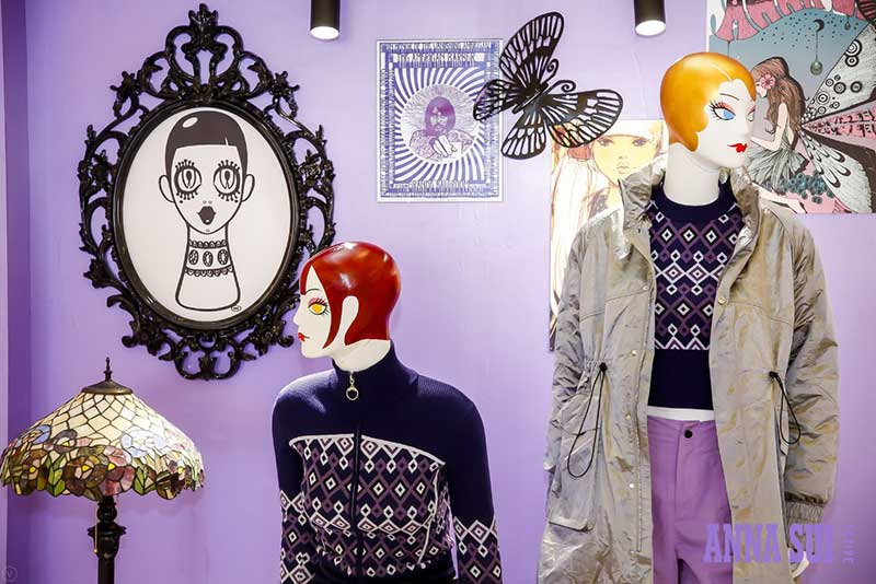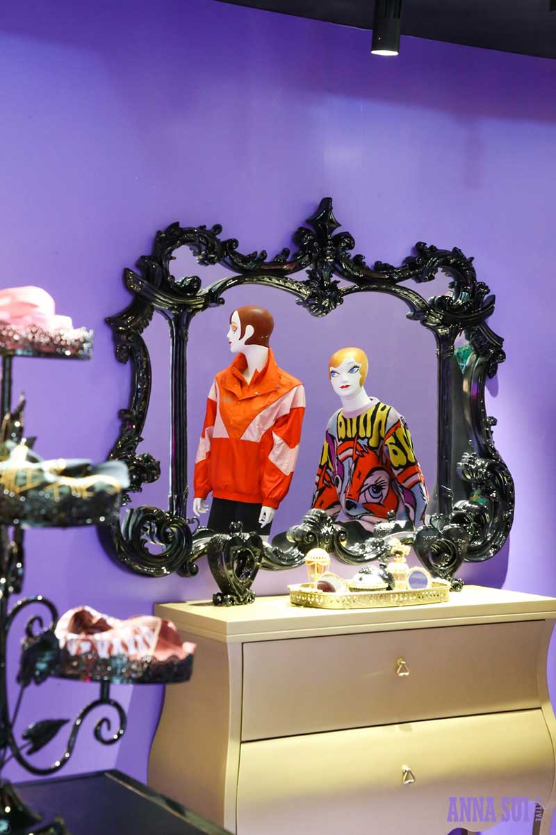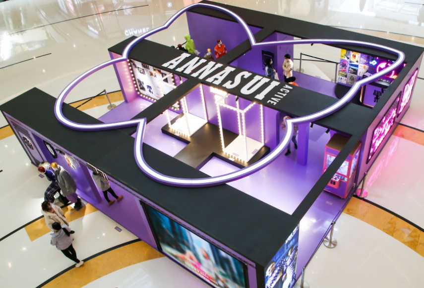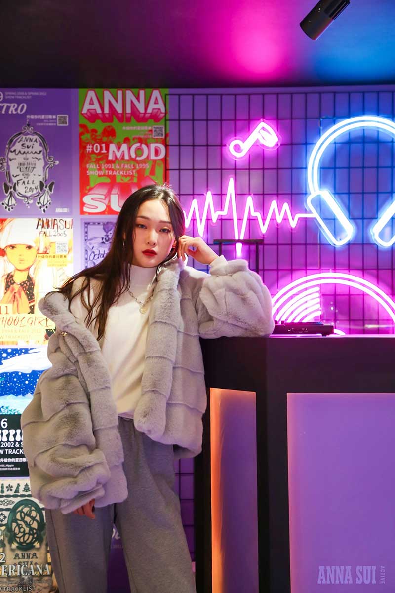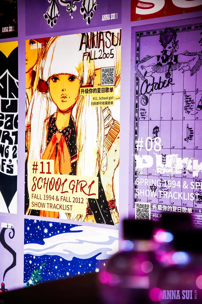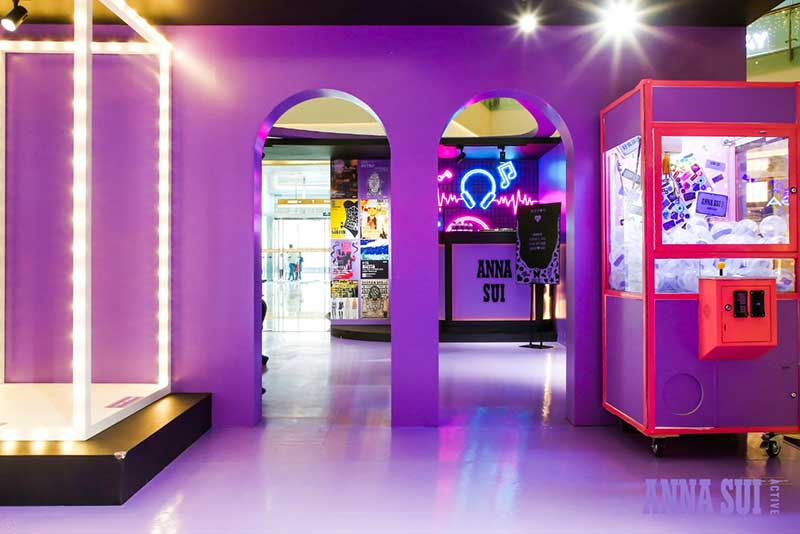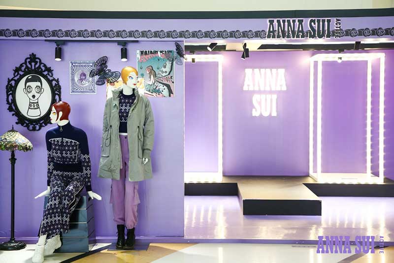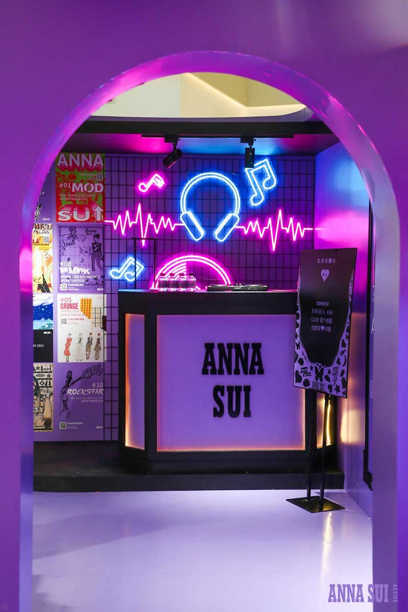 历史高光时刻都在安娜苏运动成都限时快闪店中一一呈现,霓虹灯箱的LOGO T台装置仿佛重回2013Anna Sui 纽约T台,这里曾是《安娜苏的艺想世界》展览期间,红遍魔都的打卡之地,只要站在T台上每个安娜苏女孩都耀眼十分。在快闪店里,你可以打卡人气娃娃机;体验飞镖区域创意互动,此灵感来自于安娜苏标志性元素蝴蝶,是专属于成都pop-up的特别游戏;DJ区域里,来自秀场的珍藏海报铺满了整个墙面,站在DJ区域玩起角色扮演感受安娜苏的时尚魅力。