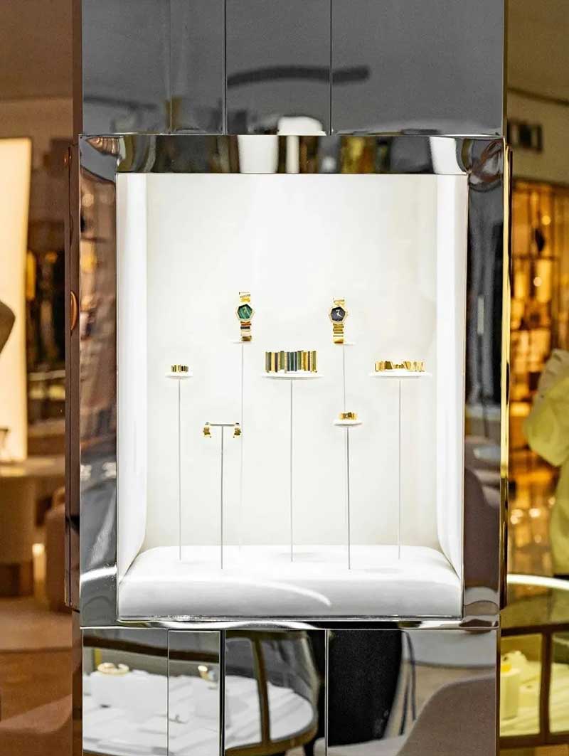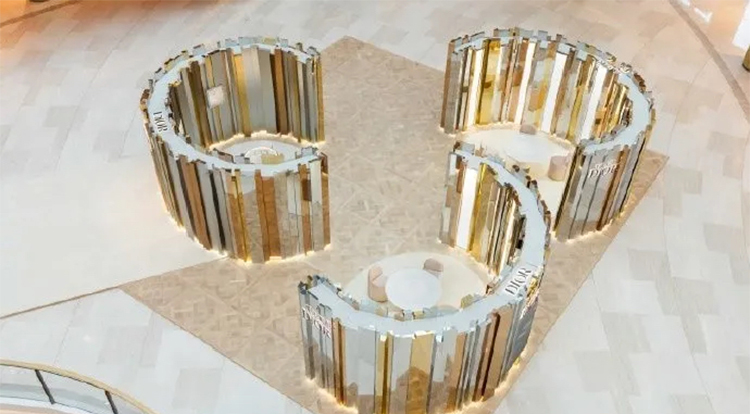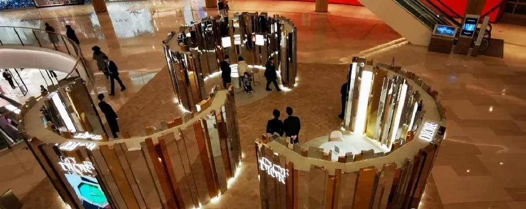 迪奥于上海恒隆广场一层中庭举办GEM DIOR高级珠宝及腕表系列限时精品店开幕酒会,开启一场全新高级珠宝与腕表的探索之旅。上海恒隆广场GEM DIOR限时精品店以连缀排列的三色镜面不规则几何造型呈现,致敬全新GEM DIOR高级珠宝及腕表系列的独特设计。白金、黄金与玫瑰金色光影交错,烘托全新系列作品利落优雅的摩登质感,呈现其独一无二的美学创意和精湛工艺。