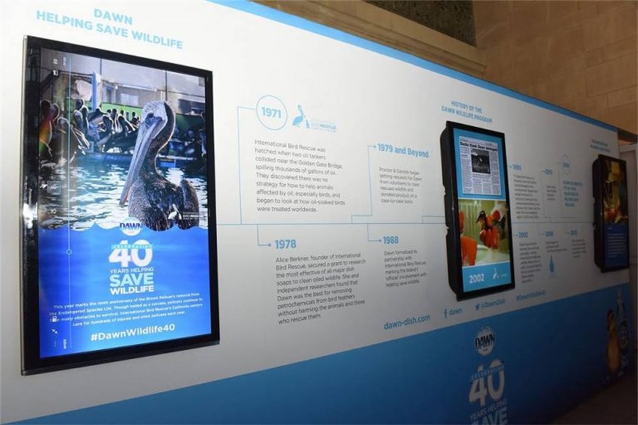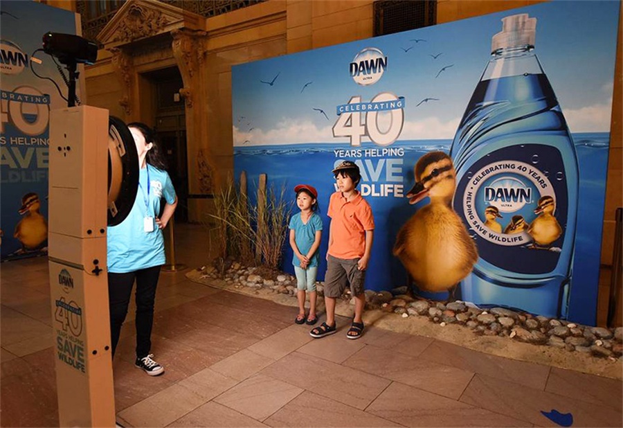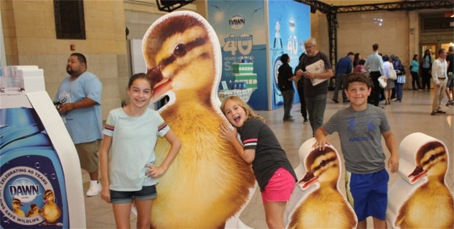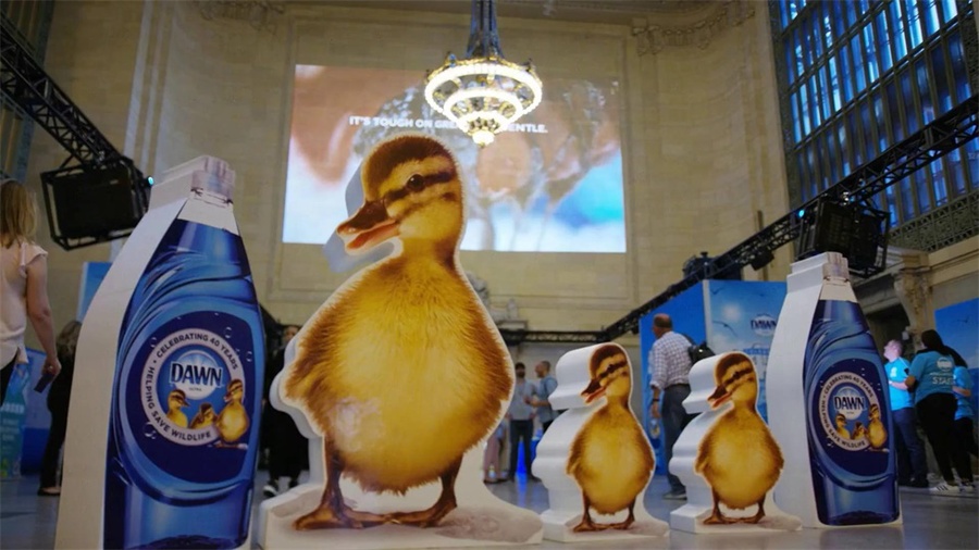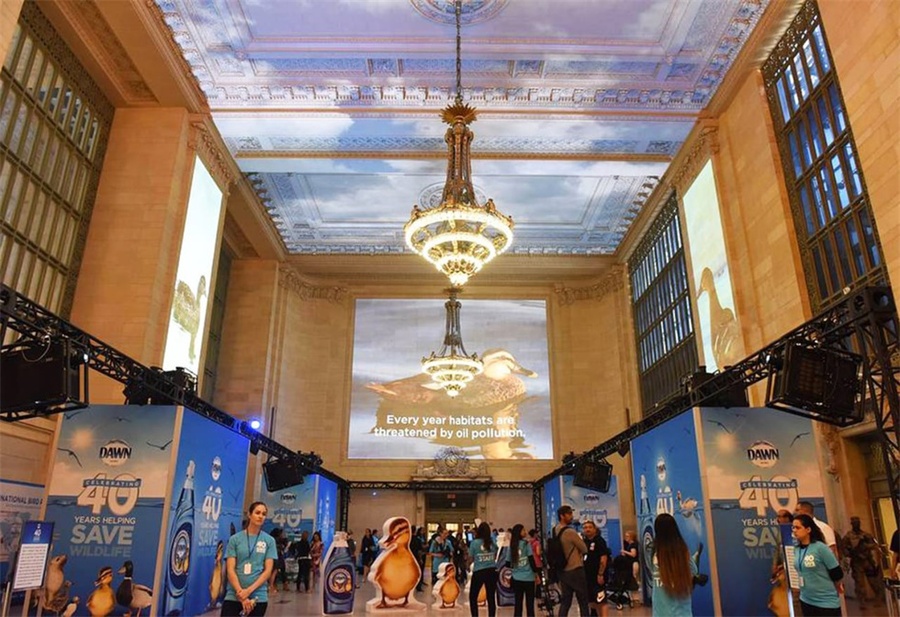 黎明(Dawn)洗洁剂刚刚成就了其品牌成长中的一个巨大的里程碑,希望举行一场盛大的庆典来庆祝。黎明品牌为了纪念救援受石油泄漏和环境灾难影响的鸟类和动物40周年,一共有超过75000只动物获救,想在纽约中央车站举行新闻发布会和消费者体验活动来纪念这一时刻,希望能吸引有公益意识的千禧一代和z世代中青年消费者的注意,加深品牌在年轻用户中的影响力。活动首先通过身临其境的多媒体体验,超大尺寸投影映射视频动画,从地板延伸到天花板,吸引好奇的通勤族,设计了GIF动图照相、立体的超级鸭子为现场的路人提供可分享的体验活动,还邀请了《纸牌屋》的女星凯特·玛拉出席现场举行的新闻发布会活动。