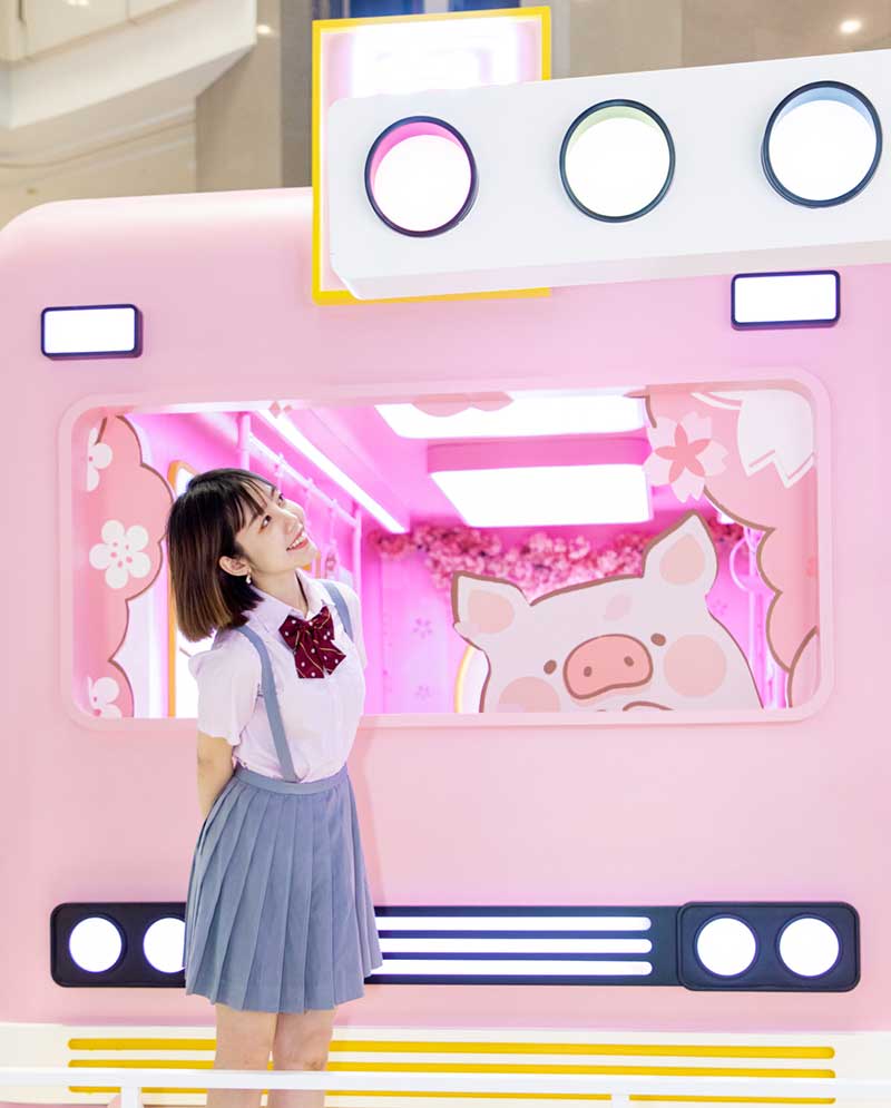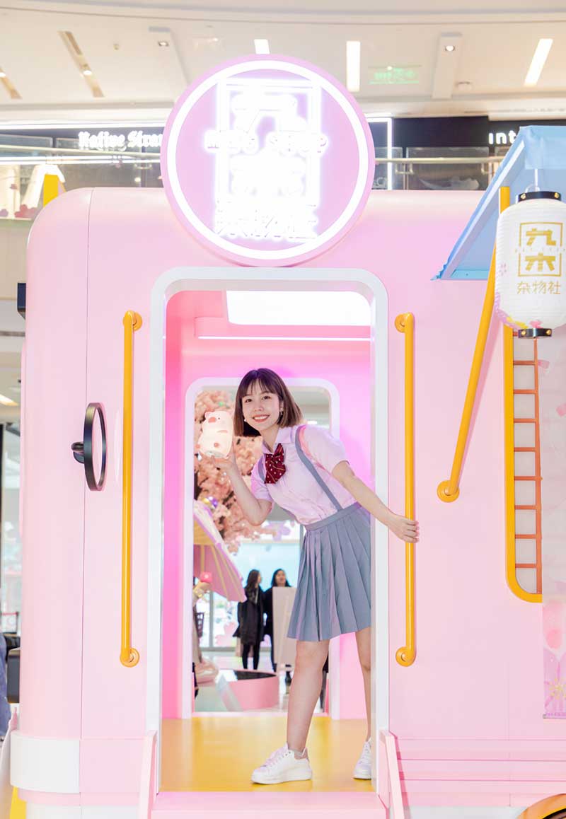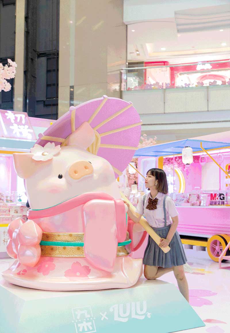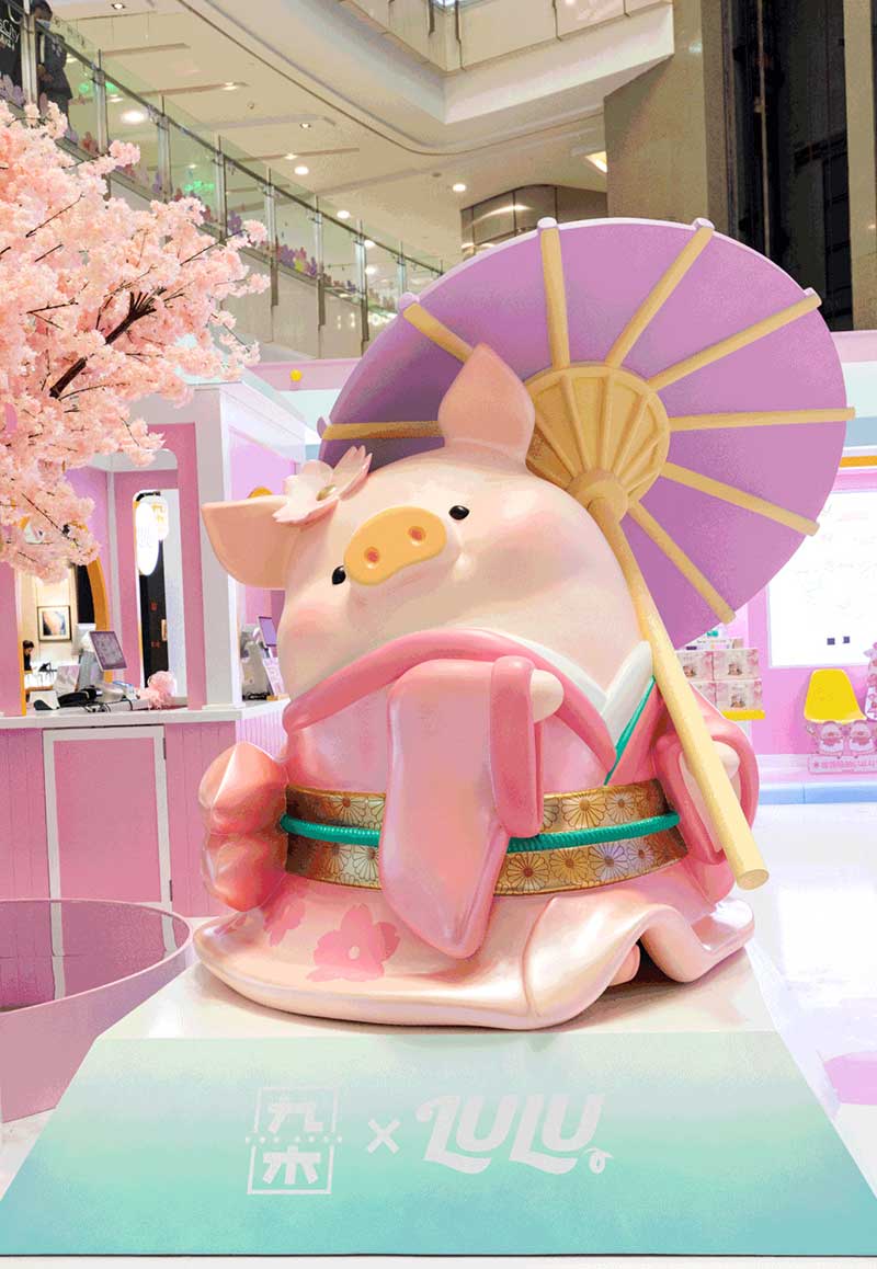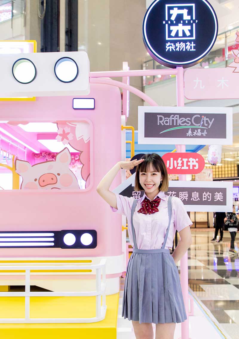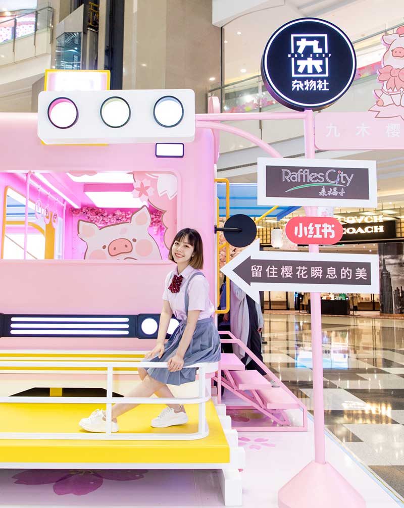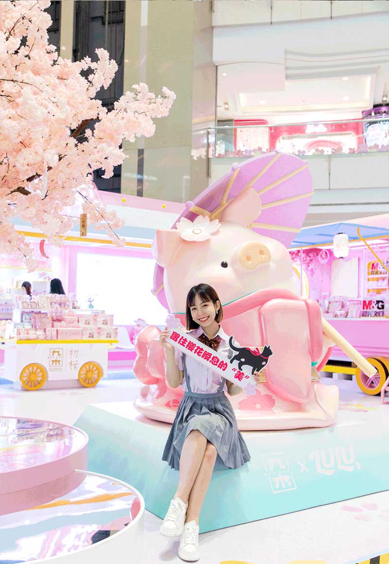 九木杂物社每年的春季都有樱花绽放,为了将樱花的转瞬即逝定格,让更多人了解到樱花的美好,今年的樱花如期而至啦,九木杂物社快闪店“春日樱花列车”驶入上海人广来福士广场。现场打造梦幻般的列车造型,淡粉色系的萌萌哒车厢,加上生动有趣的LuLu猪元素点缀,让人看一眼就会少女心爆棚。更有大陆首个2.5米高的LuLu猪公仔,而且是樱花限定和风造型哦,打伞的LuLu猪瞬间成为gogo心中的可爱NO.1。