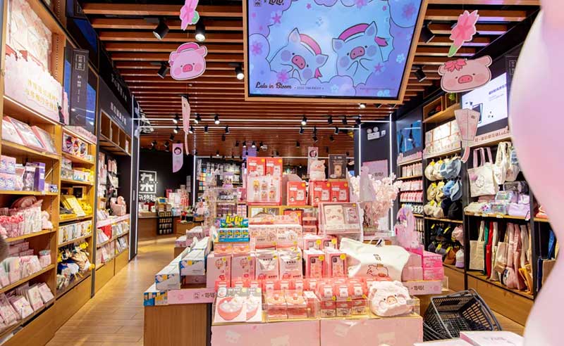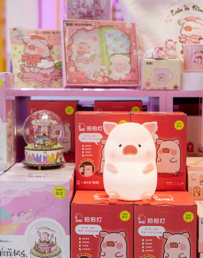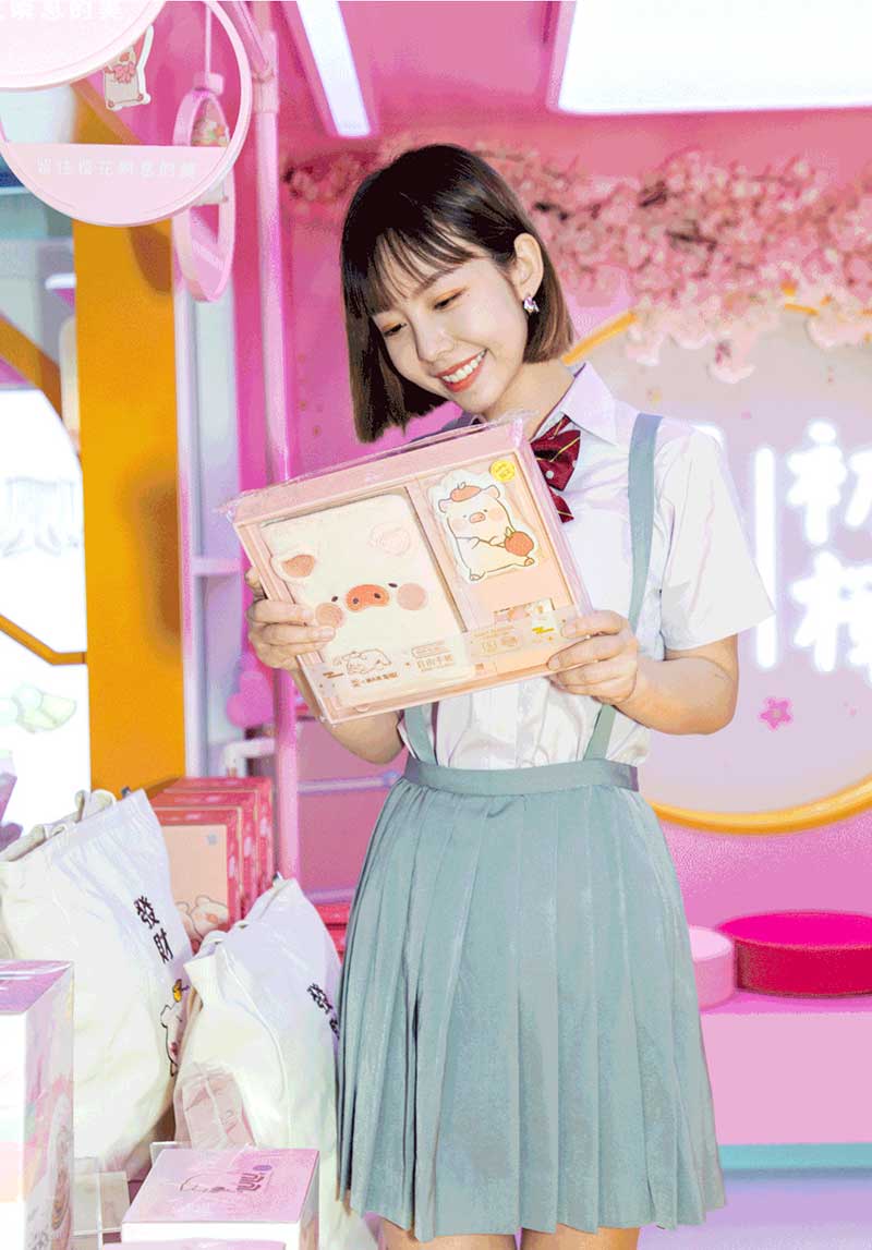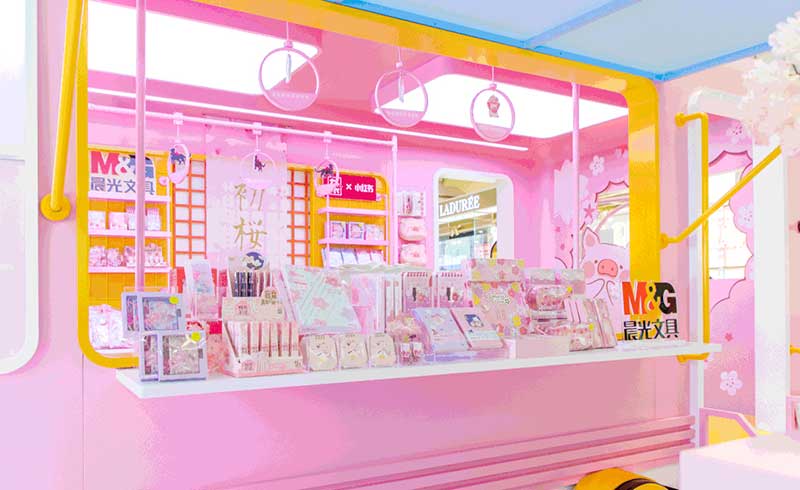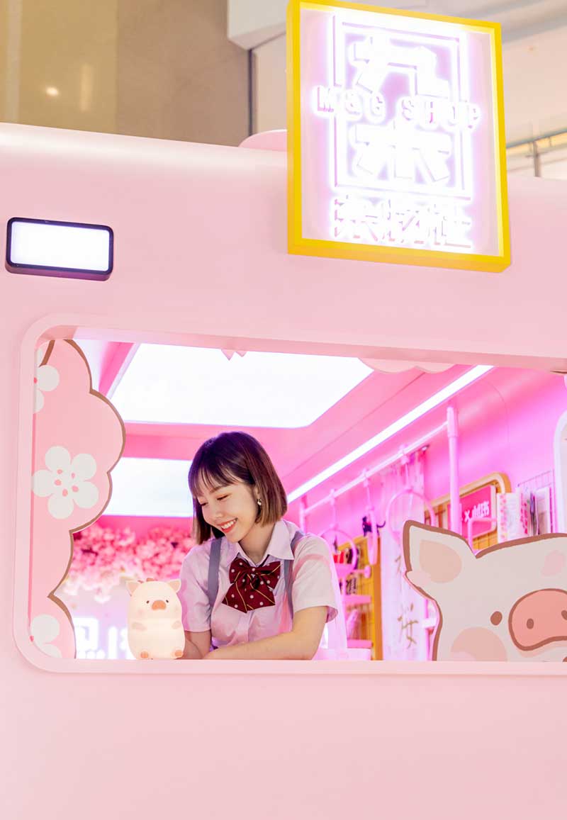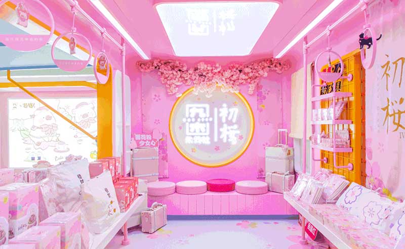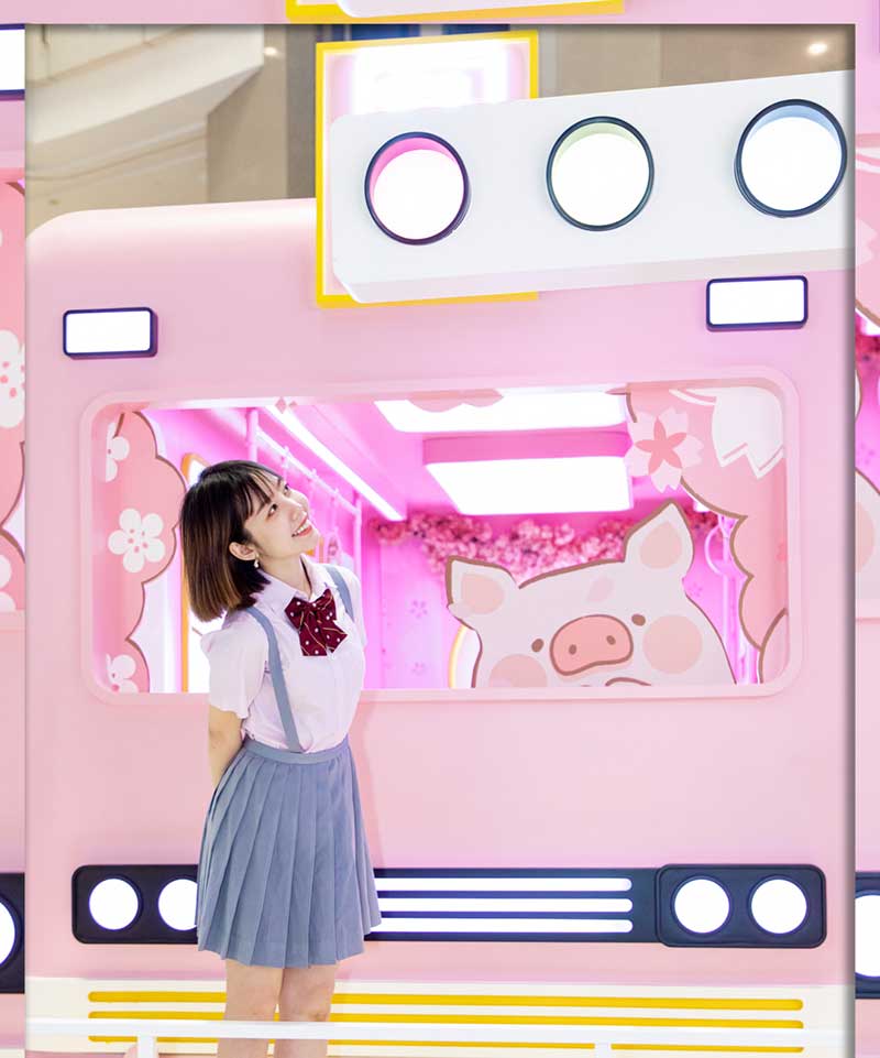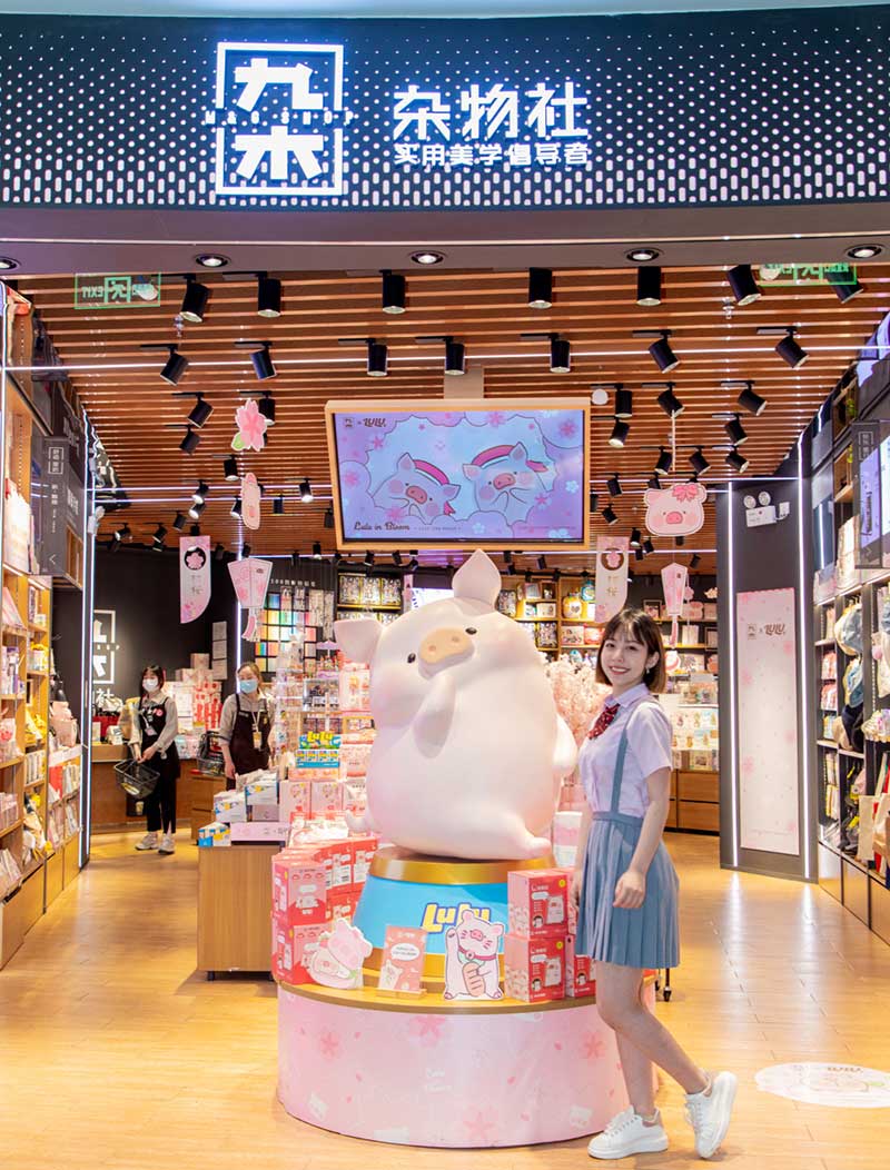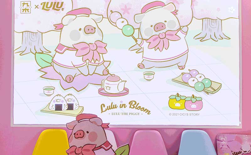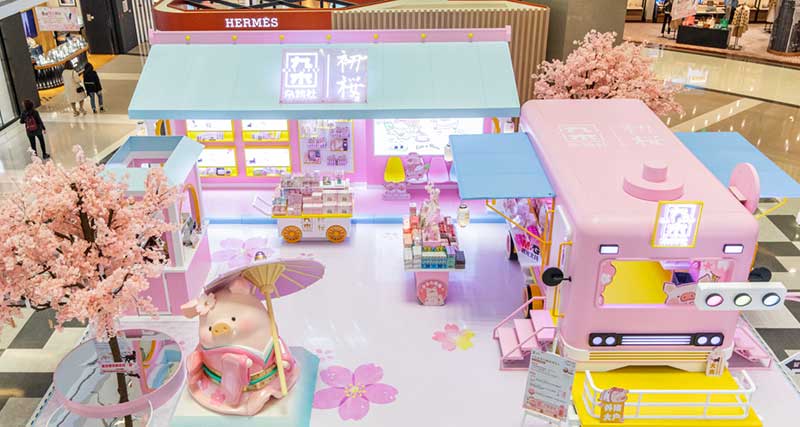 九木杂物社每年的春季都有樱花绽放,为了将樱花的转瞬即逝定格,让更多人了解到樱花的美好,今年的樱花如期而至啦,九木杂物社快闪店“春日樱花列车”驶入上海人广来福士广场。现场打造梦幻般的列车造型,淡粉色系的萌萌哒车厢,加上生动有趣的LuLu猪元素点缀,让人看一眼就会少女心爆棚。更有大陆首个2.5米高的LuLu猪公仔,而且是樱花限定和风造型哦,打伞的LuLu猪瞬间成为gogo心中的可爱NO.1。