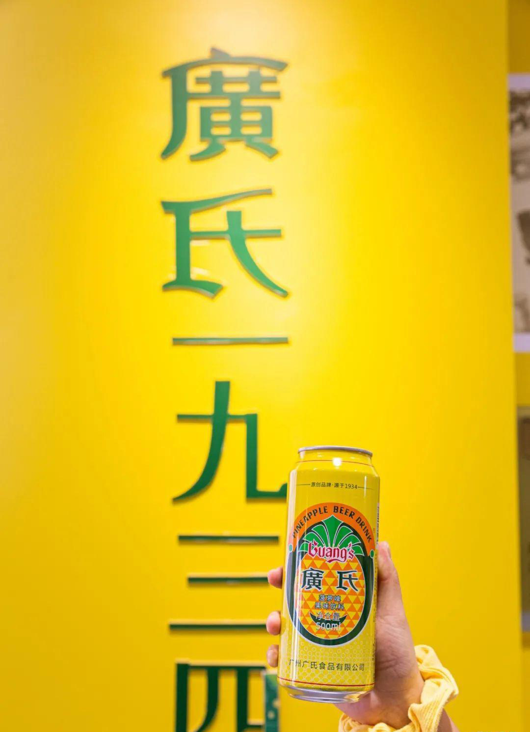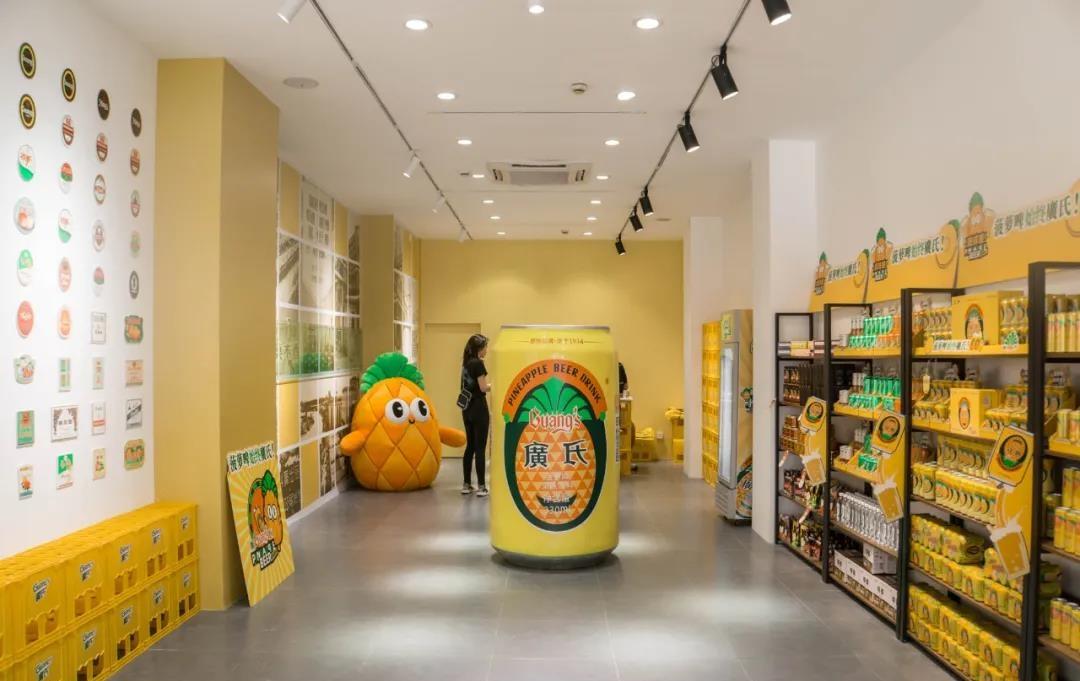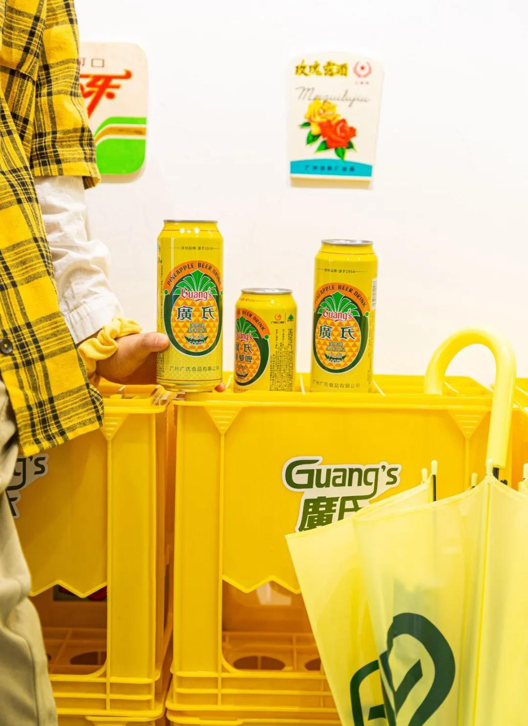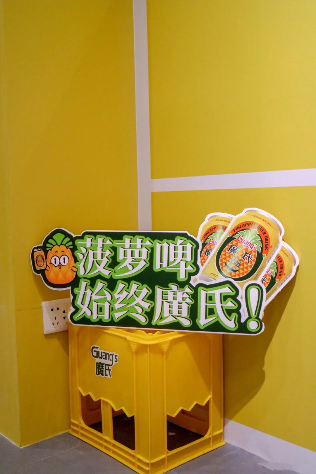 走进广氏1934北京路快闪店,各种广氏的元素映入眼帘,一帘一泻千里的“广氏菠萝啤瀑布”、一辆装满了广氏菠萝啤而“超载”的购物车、高度超过一米五的大型广氏菠萝啤易拉罐、广氏历史墙、广氏饮料箱……复古的装修设计搭配大量的“菠萝啤黄”,现场被营造成了一个广氏菠萝啤的海洋。老牌子玩新路子,广氏菠萝啤快闪店一出街迅速成为北京路上的网红打卡点!