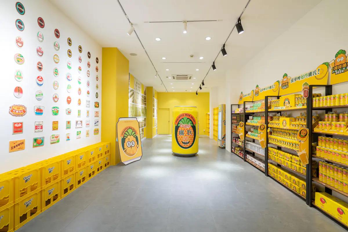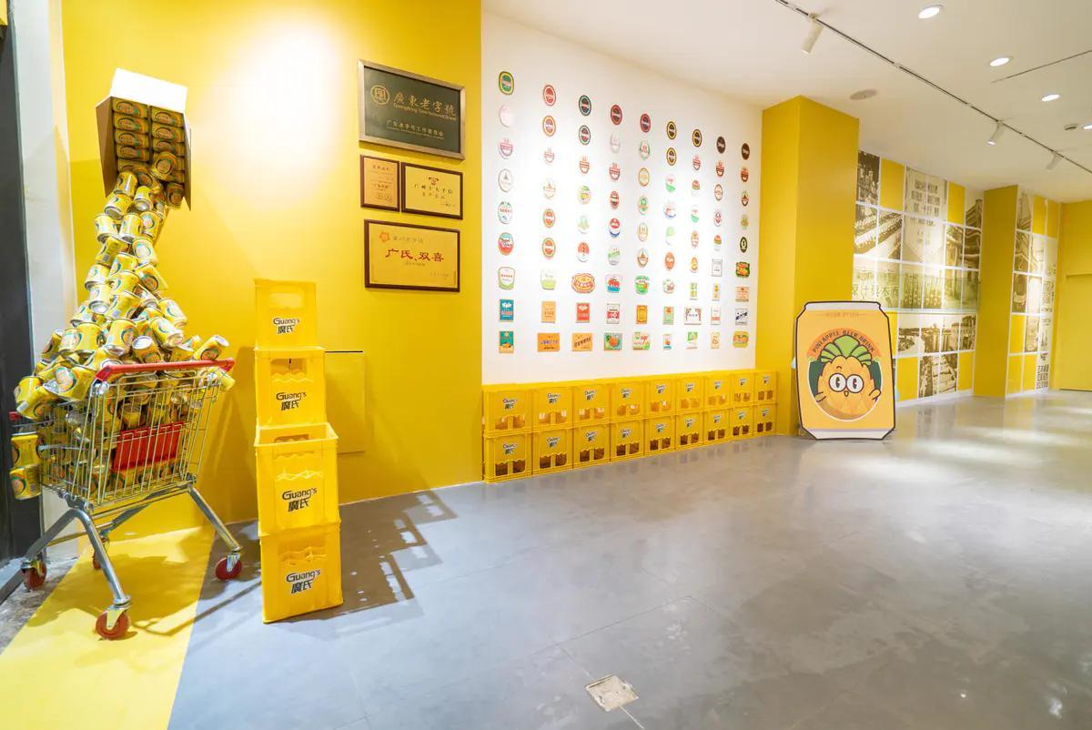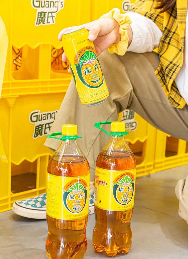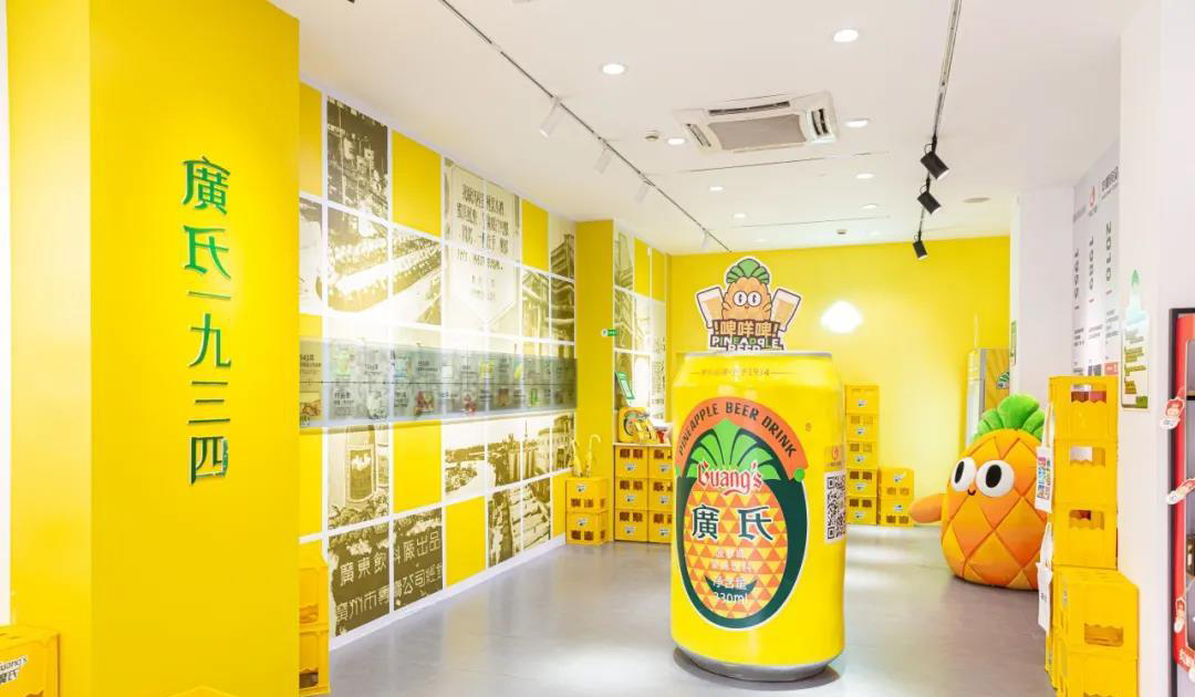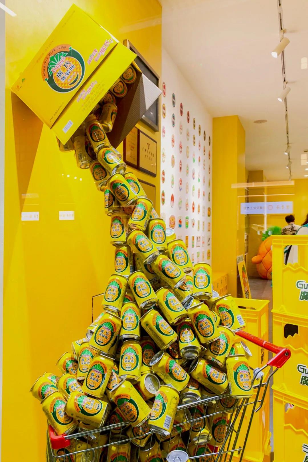 走进广氏1934北京路快闪店,各种广氏的元素映入眼帘,一帘一泻千里的“广氏菠萝啤瀑布”、一辆装满了广氏菠萝啤而“超载”的购物车、高度超过一米五的大型广氏菠萝啤易拉罐、广氏历史墙、广氏饮料箱……复古的装修设计搭配大量的“菠萝啤黄”,现场被营造成了一个广氏菠萝啤的海洋。老牌子玩新路子,广氏菠萝啤快闪店一出街迅速成为北京路上的网红打卡点!