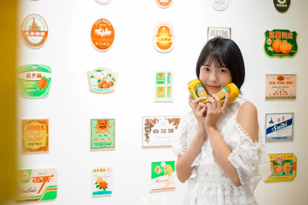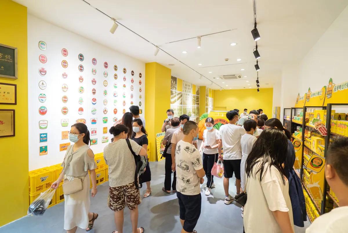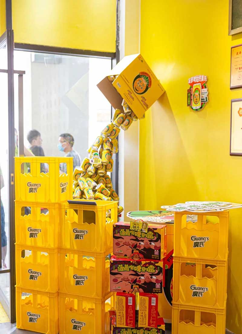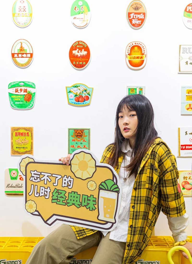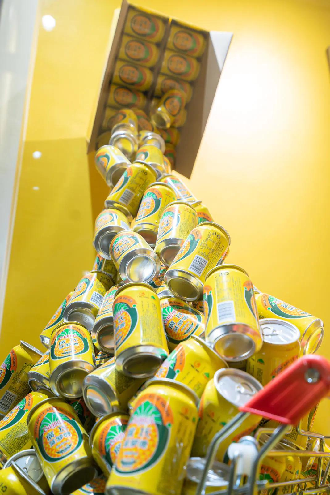 走进广氏1934北京路快闪店,各种广氏的元素映入眼帘,一帘一泻千里的“广氏菠萝啤瀑布”、一辆装满了广氏菠萝啤而“超载”的购物车、高度超过一米五的大型广氏菠萝啤易拉罐、广氏历史墙、广氏饮料箱……复古的装修设计搭配大量的“菠萝啤黄”,现场被营造成了一个广氏菠萝啤的海洋。老牌子玩新路子,广氏菠萝啤快闪店一出街迅速成为北京路上的网红打卡点!