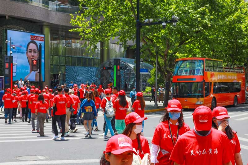 劳动节后的第一个工作日,繁华的淮海路还是如往常一样人潮涌动。突然间在黄陂南路淮海中路交叉口,百位市民在穿越人行道的时候突然变装,霎那间这个十字路口被红色所淹没。十几秒以后,随着人行道的红绿灯变红,这个路口又恢复了往常。
