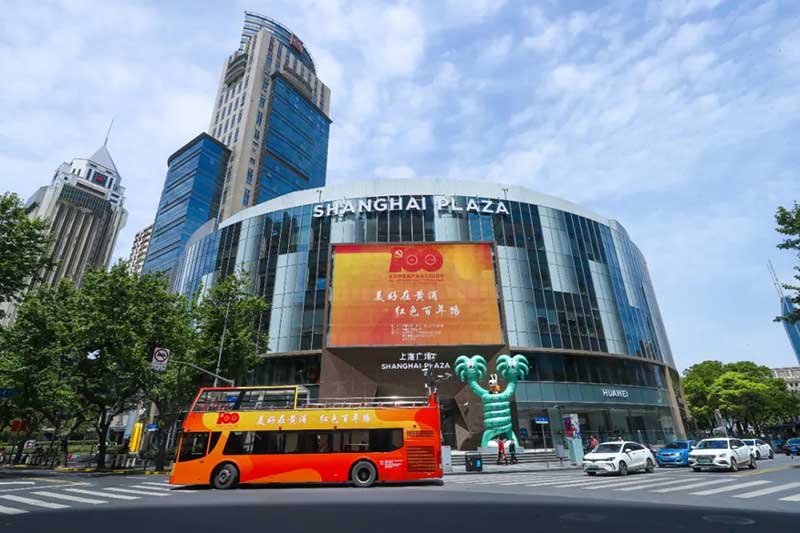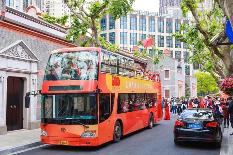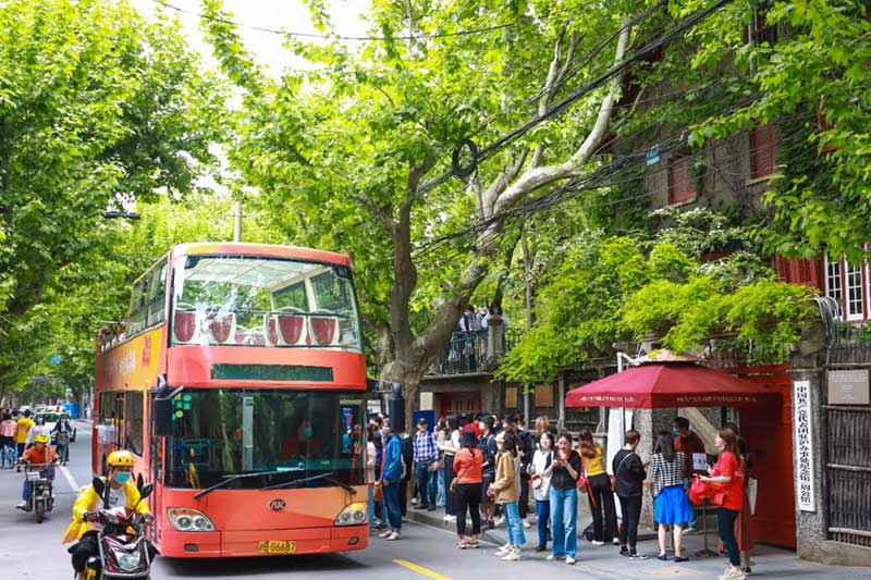 除了这场百人快闪,一辆红色的双层巴士也成了淮海路上一道靓丽的风景线。特别之处在于这辆红色双层BUS更是以一种艺术快闪的形式驶过一大会址、中国社会主义青年团中央机关旧址纪念馆(新渔阳里)、中国共产党代表团驻沪办事处纪念馆(周公馆)等极具代表性的革命旧址,用近景魔术、党史rap、小提琴乐队演奏等极具潮流度、新鲜感、话题性的艺术表演,引得路人频频驻足。