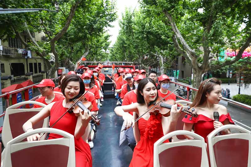 巡游中,小提琴手伴随着露天双层巴士的路线行进,悠扬的琴声传遍街区的每个角落。除了在以上三个地点进行快闪表演,红色巴士也把复兴中路、瑞金二路、南昌路、重庆南路、淮海中路等区域串联了起来。
