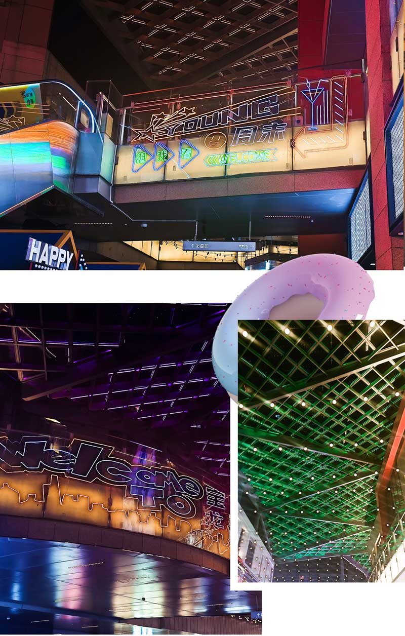 在商场门口就可以看到五彩缤纷的打卡点装置啦!夏天和彩色的霓虹灯牌超配!咔嚓一下,够燃够炸,拍出年轻态度!快来和宝龙宝杨一起HAPPY!南北入口都有炫酷的霓虹灯门头,整体氛围超级有活力,来宝杨宝龙玩点不一“YOUNG”的吧 ,不要忘了沿着商业街一直走到底还有一个巨出片的彩虹楼梯,逛吃完毕来这里拍摄彩虹大片,夏日就要来点颜色!