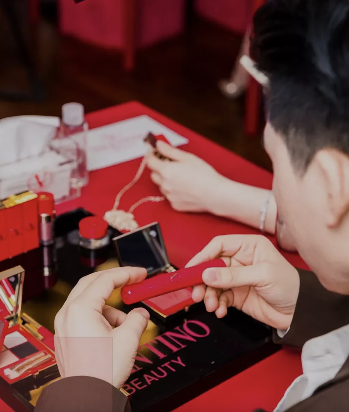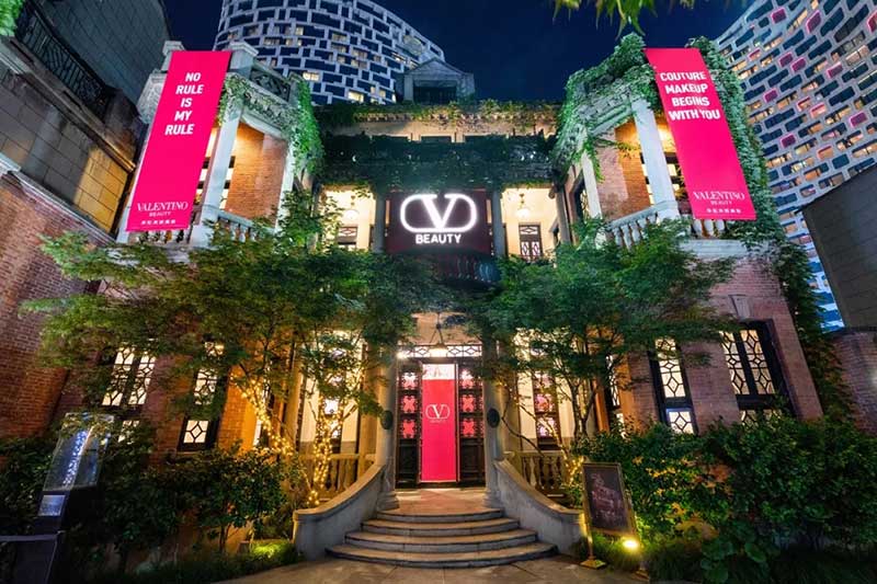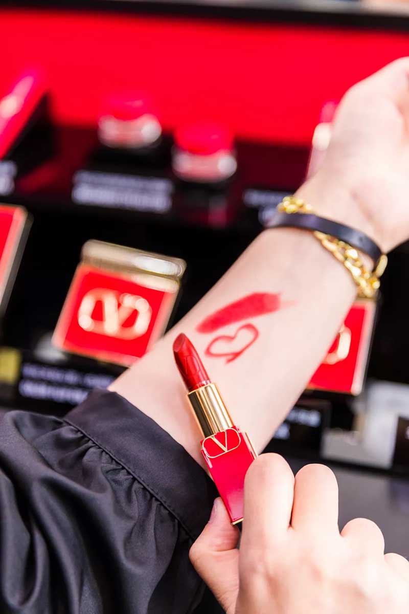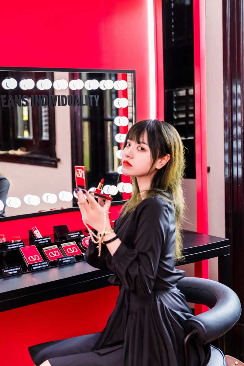 本次VALENTINO BEAUTY亮相上海,选在了新天地壹號里,石库门搭配华伦天奴的红,沧桑感里透露的高贵气质。往门内走去就可以看到这墙,特地从意大利空运而来的布料,华伦天奴记录在案的红色都在这里,已经超过3000多种,当然,这可不仅仅是供大家欣赏的,先给你们卖个关子,和后面的彩妆内容也有关系哦。在布料墙旁边还有华伦天奴的高定秀场历史记录,1950年起至2021年,每一抹“红”的瞬间都被珍藏展示在这里。再深入走还能遇见这面华伦天奴为大家准备的拍照打卡墙,标准的石库门沉稳格局里出现了如此鲜艳的红,不仅不突兀,反而让人眼前一亮,就好像本次VALENTINO BEAUTY登入中国,优雅且大气,让人期待欣喜。