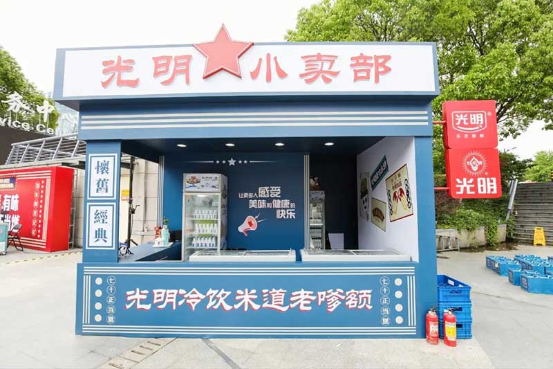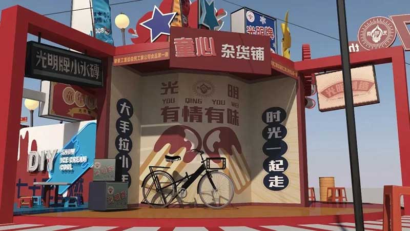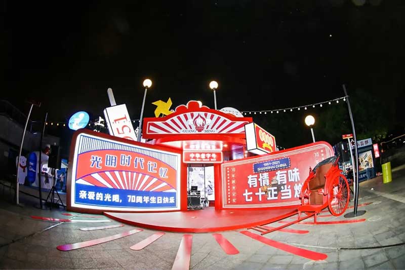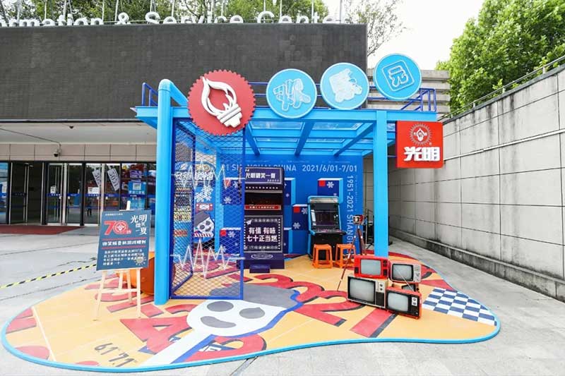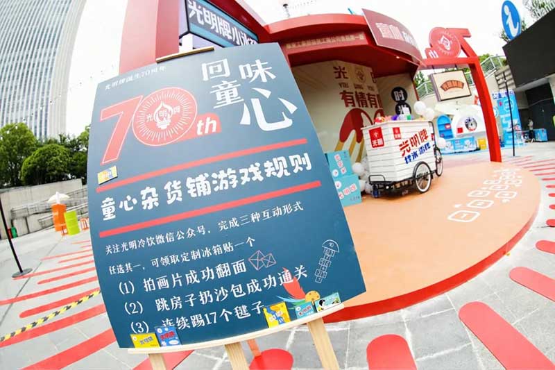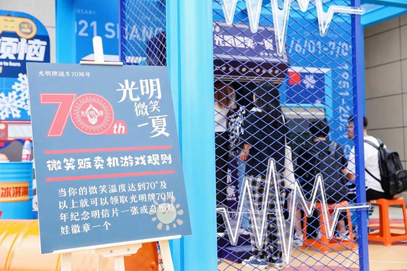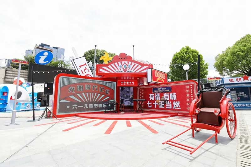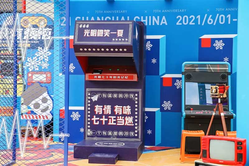 2021年恰逢光明品牌成立七十周年,亦是建党百年之际,这里见证了一个民族品牌的成长,也见证一个时代的跃迁。回首七十年峥嵘岁月,光明冷饮品牌将自己定义为“一个有温度的冷饮品牌”,70年如一日,践行初心,将这份温度和时代结合,和人文结合,和人们的生活紧密相连。所以此次活动的主题:有情有味 七十正当燃。活动现场用夸张明快的设计手法结合复古的画面内容及充满回忆的互动,展示了一个老品牌的燃动活力。这个夏天,现在让我们乘坐“光明”时光列车,带上你的童心,一起出发,前往五十年代。